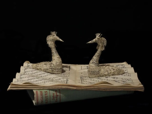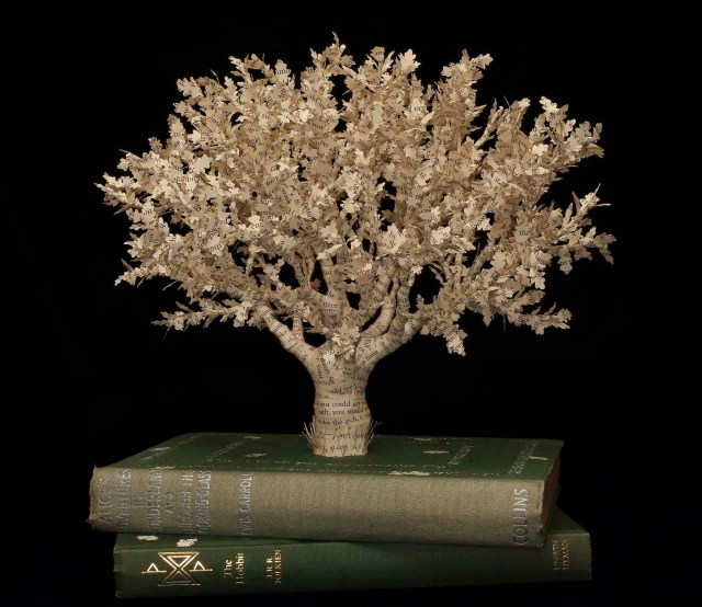 During the past few years, Taylor has experimented with different ways to position each copy, focusing on a variety of arrangements and expanding her earlier emphasis on building upward from an open spread. More valuable titles with colorful cloth covers form the basis for pieces, while others are deconstructed, reassembled, and given a new chapter. “I spend hours scouring antique shops, market stalls, and online bookstores in order to source topical books, typically dating to the first half of the 20th century,” she says. “I instantly know the right book, as I can picture the sculpture as if it has been laying dormant, just waiting to be given form.”[…]