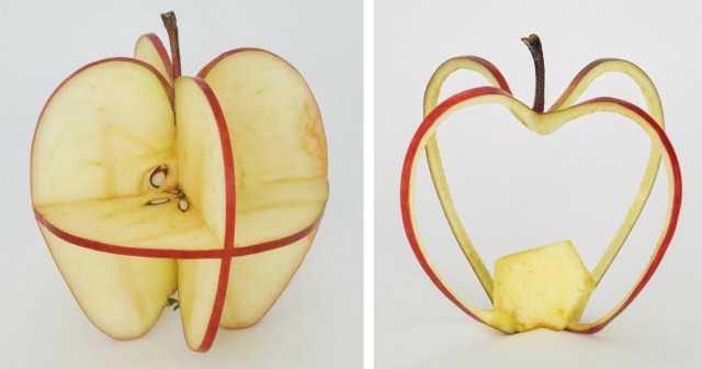 If anyone ever told Can Sun not to play with his food, it’s a good thing he didn’t listen. The London-based Chinese artist meticulously carves red apples into geometric cross-sections and linking chains, sometimes adding accoutrements like brass hinges. Delicate slices are puzzled together to form circles or the skin carefully removed to reveal interlocking, rope-like shapes, as if the apple is caught in a net.