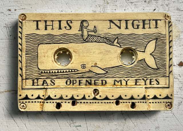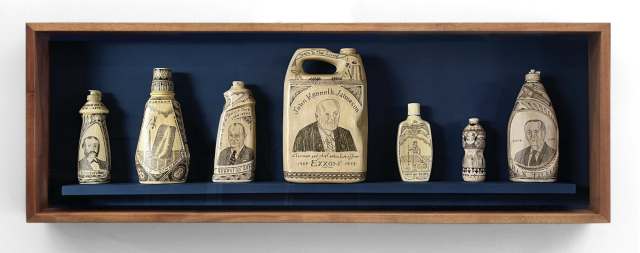 Artist Duke Riley is attuned to this history and its modern-day implications. He gathers laundry detergent jugs, flip-flops, and bottles that once held household products once they wash up near beaches and carves incisive allegories and ornamentation into their surfaces. Painted in a warm, grainy beige, the scavenged waste mimics the whale bones traditional to scrimshaw while the artist’s signature wit emerges through the contemporary narratives of oil barons or marine creatures carrying human trash.