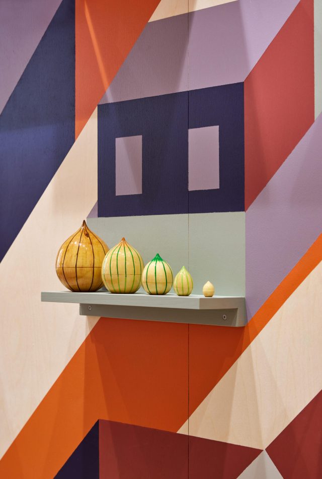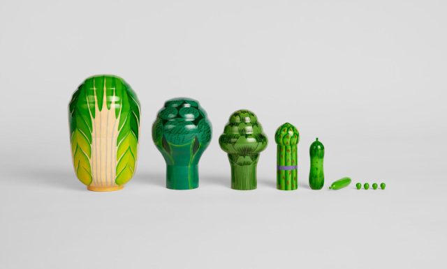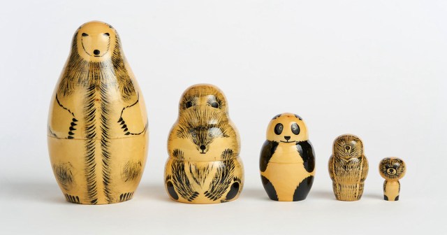 The decorative toys date back to the late 19th century when the first set was conceived by folk artist Sergey Malyutin with the assistance of a wood carver named Vasily Zvyozdochkin. The basic design consists of a set of pieces that decrease in size, fitting into one another, and traditionally depict a mother doll whose children, including a baby, fit inside. Song and Olin playfully reimagine the possibilities of matryoshka sets by portraying a diverse range of families, flora, and fauna, emphasizing the joy of discovery as each set is opened to reveal its inner dwellers.[…]