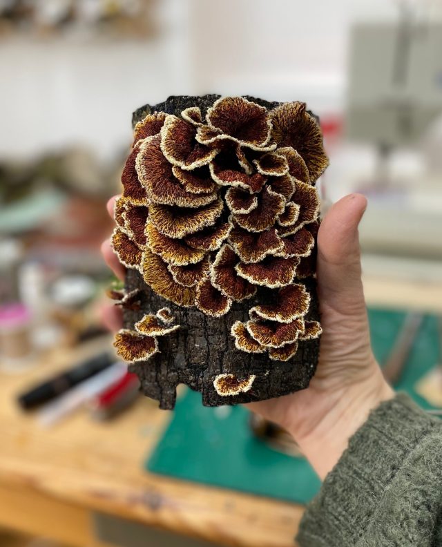 Cobbett complements an array of mushrooms with soil-coated roots and carpets lifelike pieces of bark and twigs in diverse lichens. Over time, she has developed techniques that allow her to work on a minuscule scale, often putting specimens under magnification to detect the tiniest characteristics. “I mix the weights of the sewing threads from the bobbin and the spool, often using a 75 to 100-weight thread to enable me to get the finest detail,” she says. […]