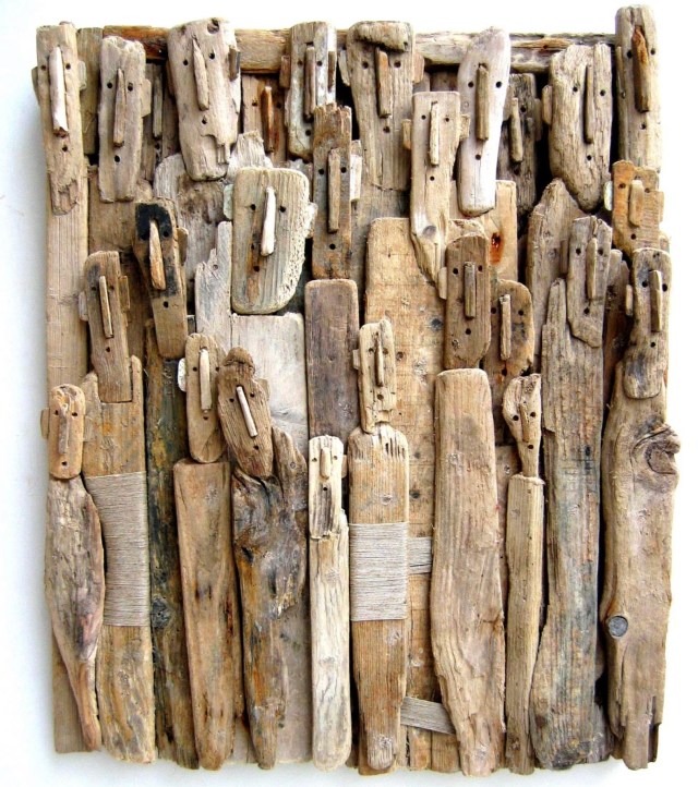 Characterized by elongated noses and tiny, punched eyes and mouths, Marc Bourlier’s expressive figures gather in a perpetual state of curiosity and surprise. The artist scours the beaches near his home in Normandy for driftwood, gathering an incredible variety of sizes and shapes to take back to the studio. He complements the weathered grain with carefully whittled heads and long, limbless bodies, packing the individuals tightly together on platforms or organizing them into compartments.