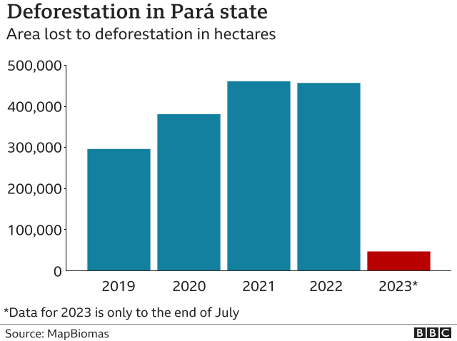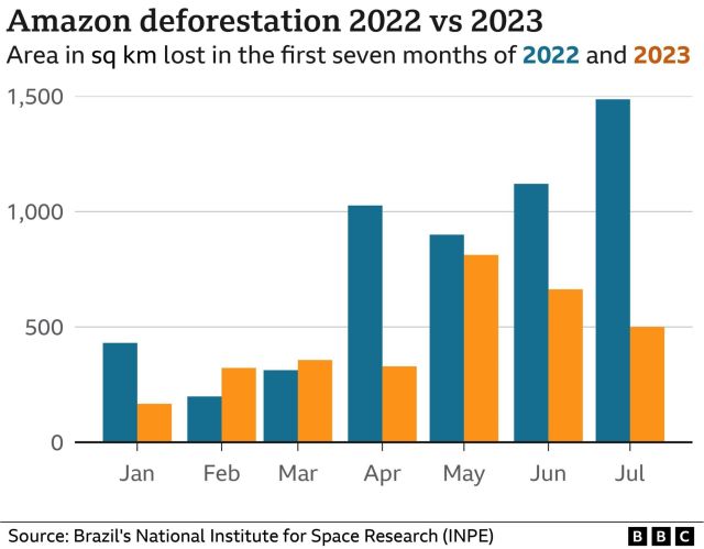 President Lula has promised to reverse rising deforestation seen under his predecessor, Jair Bolsonaro. In July this year, deforestation fell 66% compared with the samw month in 2022, and Lula says he is committed to zero deforestation by 2030.