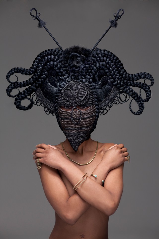 In her series Highness, Delphine Diallo’s regal subjects don elaborate masks, headdresses, and jewelry. Captured in both color and black-and-white, the women are portrayed as timeless and noble, wearing body paint, jewelry, and attire that draw on mythology and spiritual symbols to explore what the photographer calls the “divine female body.”