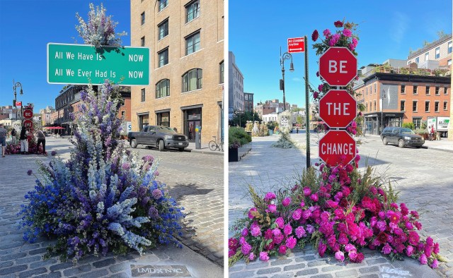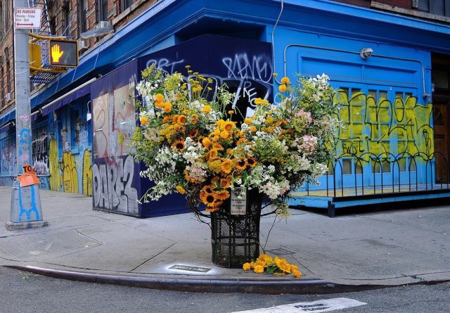 Known for his ‘Flower Flash’ installations, Lewis Miller sees phone booths and trash cans as vessels for enormous floral arrangements.