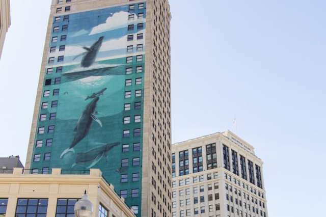 This large-scale piece was created by Michigan-born artist Robert Wyland in 1997. Painted on the rear façade of Broderick Tower in Downtown Detroit, the mural covers 20 floors of the 34-story building, depicting a group of whales swimming in the ocean. On top of its prime location within the city, its vicinity to Comerica Park, home of the Detroit Tigers baseball team, allowed fans to gaze at the painting from the stadium stands.