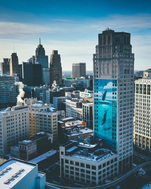 Then, in late August, a bout of bad weather hit the Detroit area. During the storm, the Rocket Companies ad was ripped in half. As the pieces flapped in the breeze, locals were able to catch the first peek at the whales in a long time. A few days later, the remnants of the vinyl ad were removed—and so Wyland’s piece recovered its spot in the Detroit skyline.