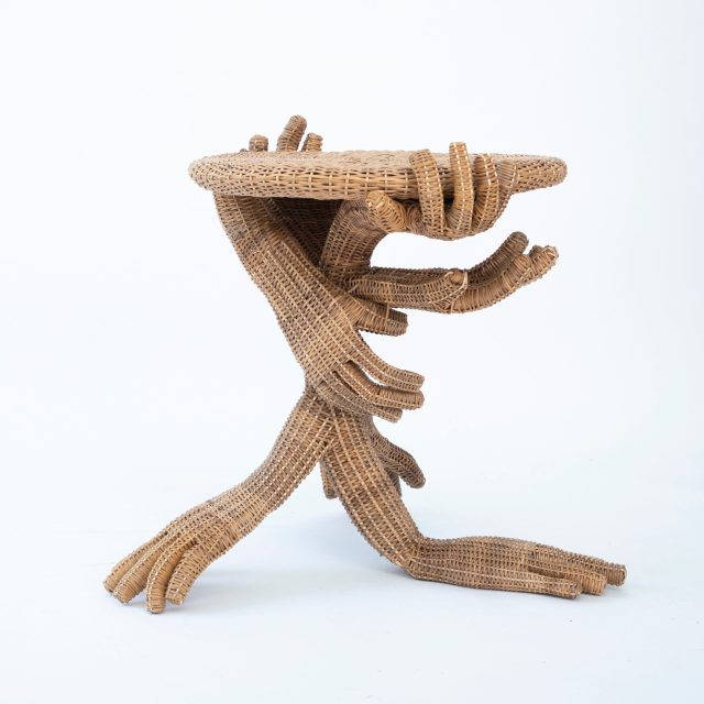 The artist works with local weavers in Medellín, using wicker sourced from the Colombian Amazon. Beginning the process in his studio by sculpting tentative chair forms out of clay, Wolston then creates blueprints of the final design before welding a frame for the wicker to be woven into. Experienced weavers who have practiced the craft for decades slowly but surely bring each bodily piece to life, row after row, detail after detail.[…]
