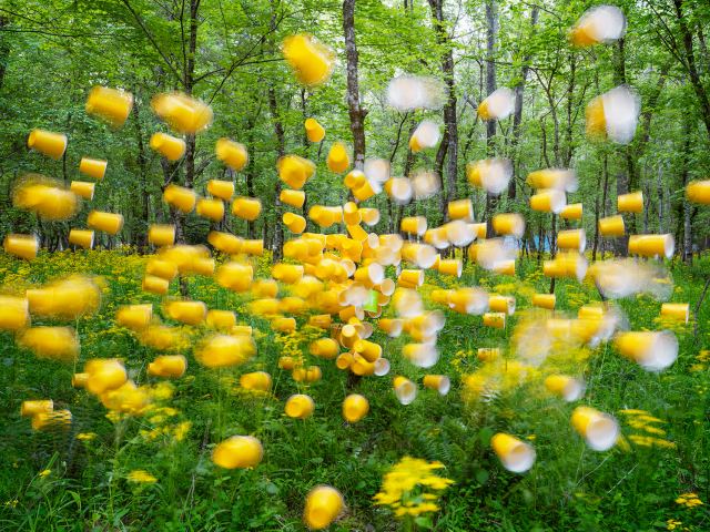 Ethereal sheets of tulle appear to hover in spectral motion over meadows and in copses of trees in Thomas Jackson’s latest photographs. “If there’s a theme I’m focused on this year, it’s the relationship between the materials I use to make my installations and the landscapes they inhabit,” he tells Colossal. Each ephemeral installation (previously) responds to the surrounding environment, changing shape as it interacts with the wind. Often documented during the golden hour, the layers of thin fabric shift to become more or less opaque, overlapping into various color combinations in the light.