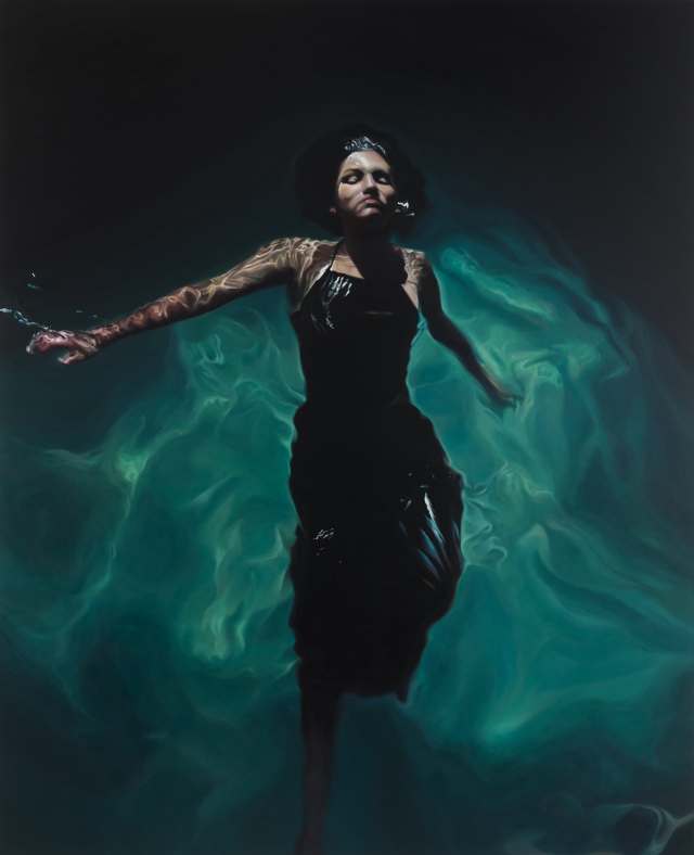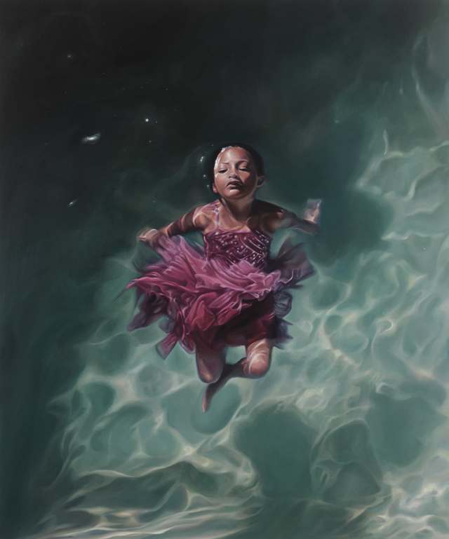 In A Certain Oblivion, Rawles renders two of her daughters who gracefully float together and apart, their heads just above the surface. Placing the next generation in such vulnerable, precarious positions alludes to the resilience and determination needed to rise above “the riptides of contemporary American life,” a statement says. Despite facing the threat of being consumed by the current, the figures remain calm and graceful, carrying on and resting at the surface.