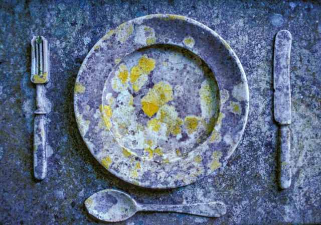 “I found this unusual situation at an abandoned farm near Sintra, Portugal. A complete place setting had been left behind on a stone table. I was very surprised to see that the whole ensemble was covered in lichens. The table stood under a huge tree which most likely provided the shade and moisture needed for the lichens to grow over the course of decades.”[…]
