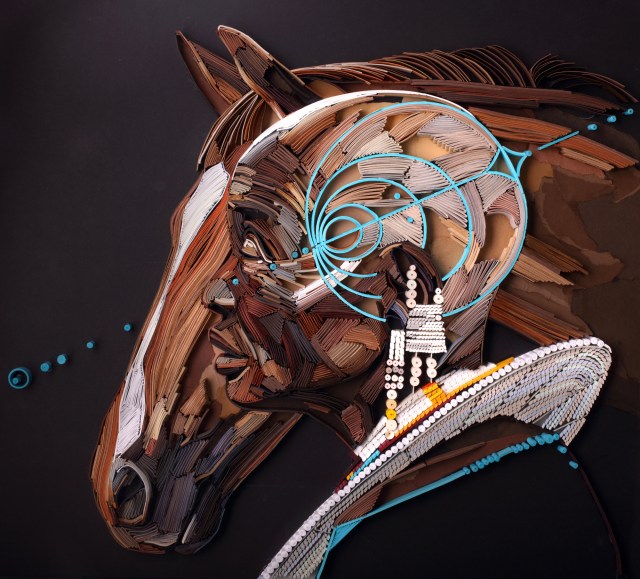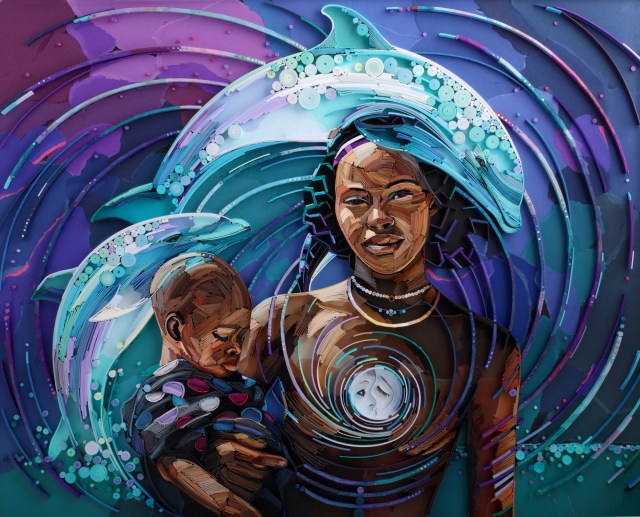 In her new pieces, Brodskaya continues to explore resilience and hope through dreamlike portraiture. She meticulously cuts, creases, and curls thin pieces of paper to build up a relief one strip at a time, adding mystical elements like swirls and geometric shapes. In “Envisage,” a human profile merges with that of a horse, while in “Mother Energy,” leaping dolphins reflect the strength, connection, and joy of motherhood.[…]