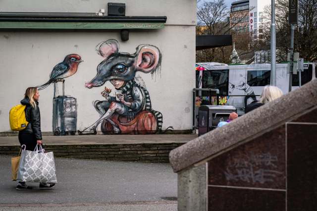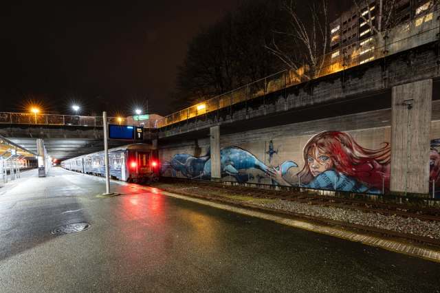 A mouse-costumed girl sitting on a duffel bag, a bird balancing on a unicycle, and bright blue narwhals swimming along the train line in Stavanger, Norway, are a few characters in Hera’s new murals considering the nuances of immigration and movement. “We all are Birds of Migration. Some With Feathers, Some Without” is a collection of works that ask viewers to recognize that mobility and resettling have been essential to human survival for millennia. The artist (previously) says: