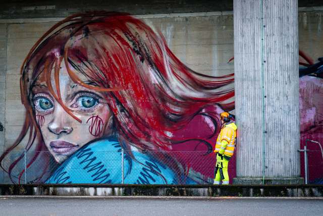 A mouse-costumed girl sitting on a duffel bag, a bird balancing on a unicycle, and bright blue narwhals swimming along the train line in Stavanger, Norway, are a few characters in Hera’s new murals considering the nuances of immigration and movement. “We all are Birds of Migration. Some With Feathers, Some Without” is a collection of works that ask viewers to recognize that mobility and resettling have been essential to human survival for millennia. The artist (previously) says:
