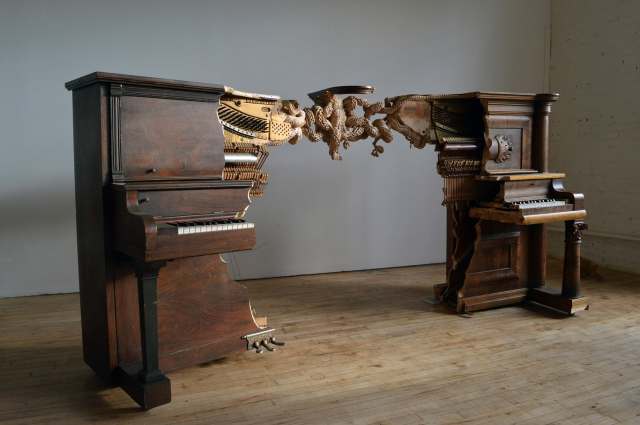 The resulting sculpture connects through a tangled, textured knot of octopus tentacles, of which the eight arms correspond to the eight notes of the octaves available within the keyboard. Chiseled into the bodies of both pianos—the right features a lively Minoan-style marine illustration on its surface—the mollusk camouflages a miter joint, or an angled cut between two pieces of wood, that tightly fastens the instruments together. […]