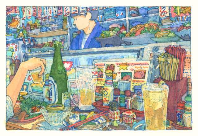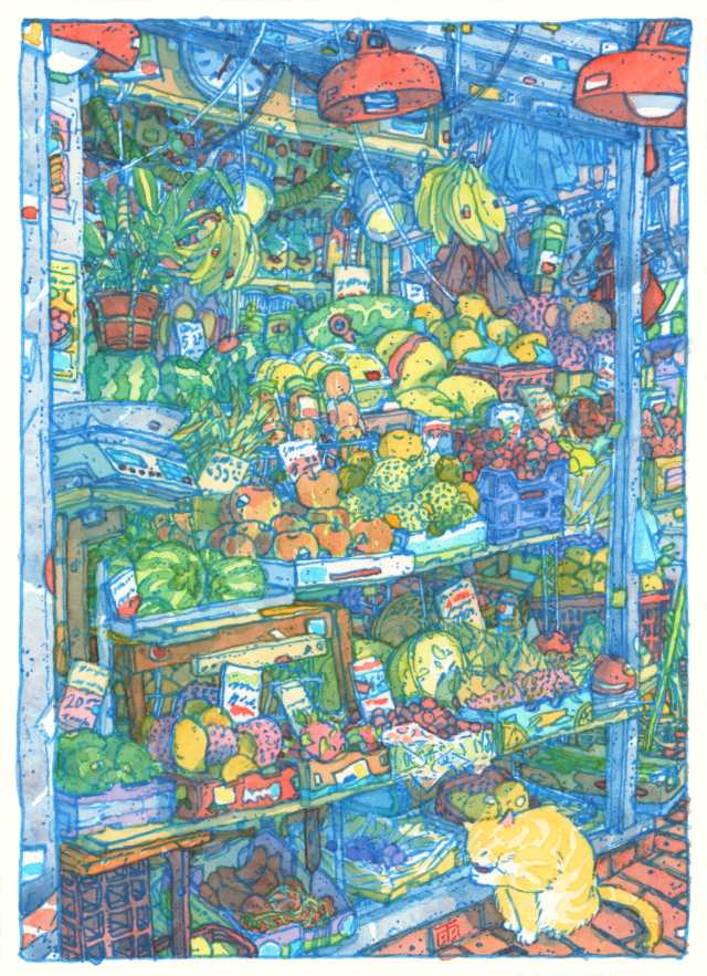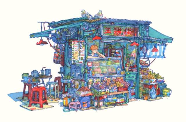 From a bustling cafe to the comfort of a family meal to the morning quietude of a specialty shop, Rain Szeto’s illustrations (previously) capture inviting, everyday places in vibrant detail. The artist’s portraits of local places often radiate from a central vignette of a lone employee, a family interaction, or feline resident making its daily rounds. She treats every scene with with great attention to its unique characteristics, outlining stacks of merchandise, architectural details, and personal effects into chaotic yet appealing tableaux.