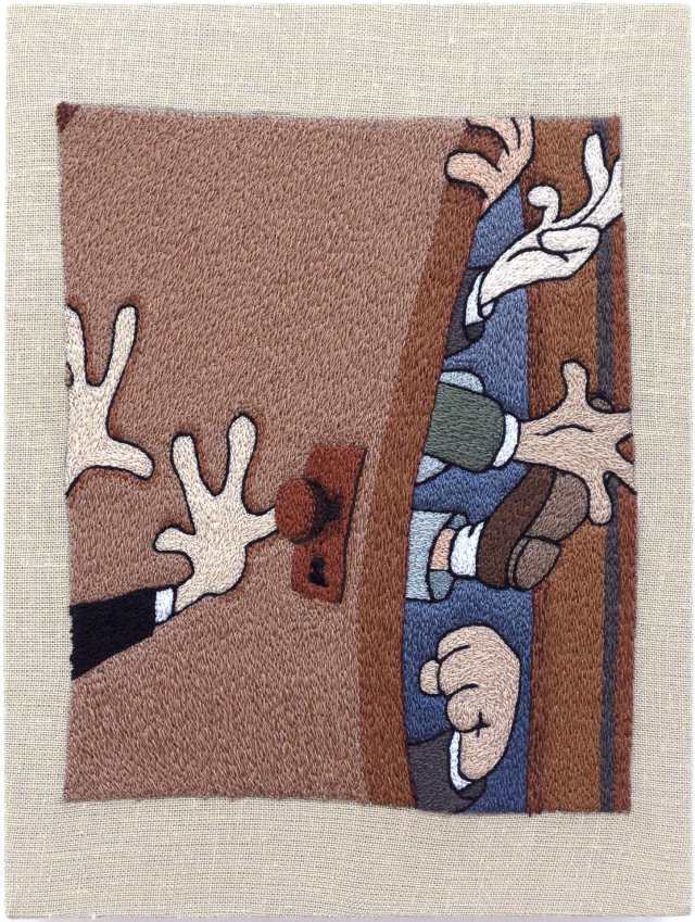 Recent works include a Looney Tunes-style mishmash of feet and fists that burst through a bulging door in “Some locks won’t hold” and the tongue-in-cheek archery challenge of “Going easy on myself.” Often focusing on escalated tensions, the embroideries accentuate moments of high anxiety in a nostalgic, comforting childhood medium.