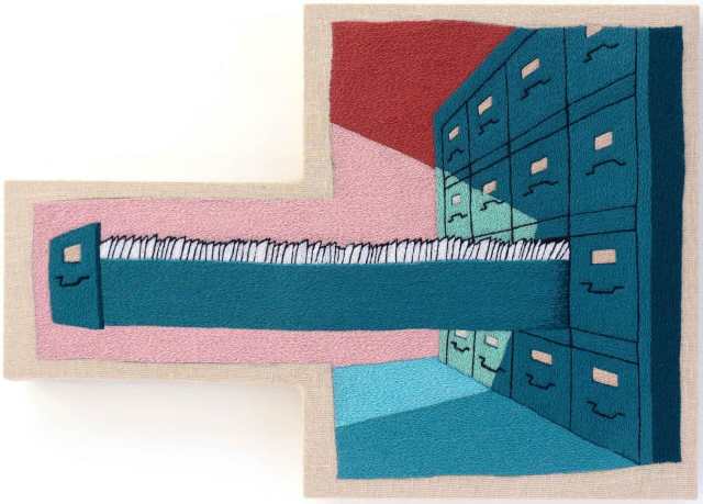 Recent works include a Looney Tunes-style mishmash of feet and fists that burst through a bulging door in “Some locks won’t hold” and the tongue-in-cheek archery challenge of “Going easy on myself.” Often focusing on escalated tensions, the embroideries accentuate moments of high anxiety in a nostalgic, comforting childhood medium.