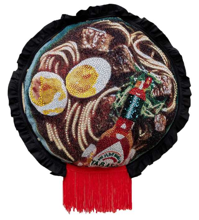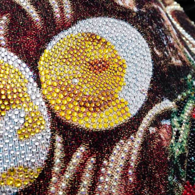 Working on digital jacquard weavings, Akea Brionne adds rhinestones, infusing a sense of decadence into each tapestry.