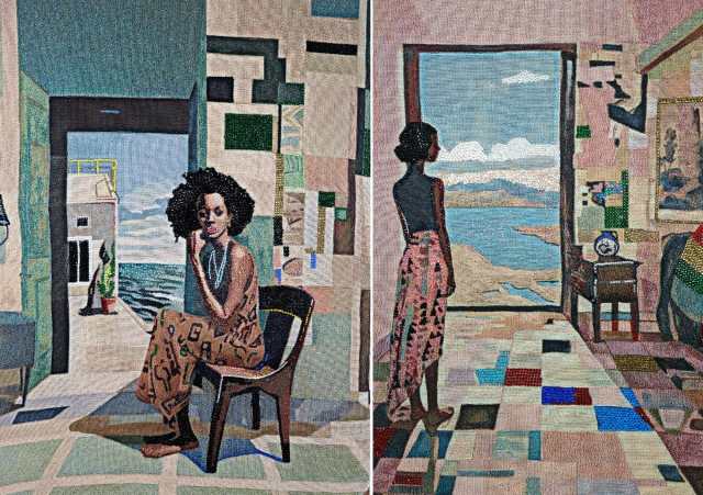 Working on digital jacquard weavings, Brionne stitches rhinestones to garments, tiled floors, and other details, adding an element of decadence to each tapestry. Many of the portraits shown here were on view recently at Lyles & King in New York for Brionne’s solo show, Roses Grow in Southern Soil, and investigate “her grandfather’s journey between Mississippi and New Mexico in the 1970s at the tail end of The Great Migration.” She is interested in the lingering effects of colonialism and the African Diaspora, particularly as it relates to memory and how stories are passed from one generation to the next.
