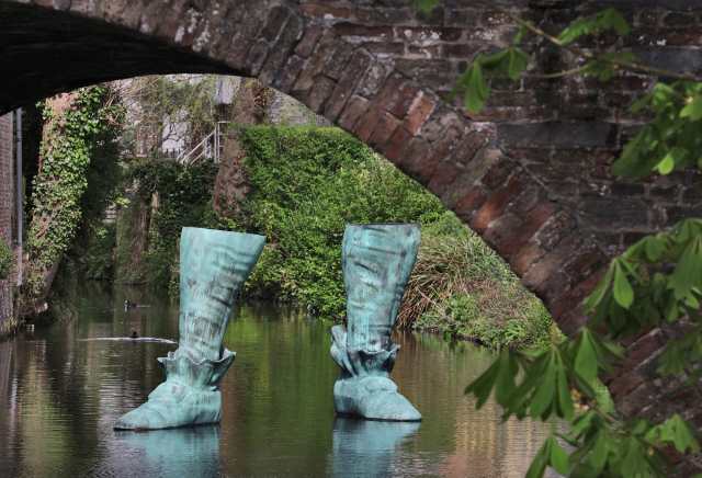 A pair of sizable bronze boots have paused in a Bruges canal, the whereabouts of their owner unknown. The striking bronze sculpture titled “Who?” by Ivan Argote appears as if an 18th-century statue has been shorn at the knees, inviting speculation about the wearer’s identity.