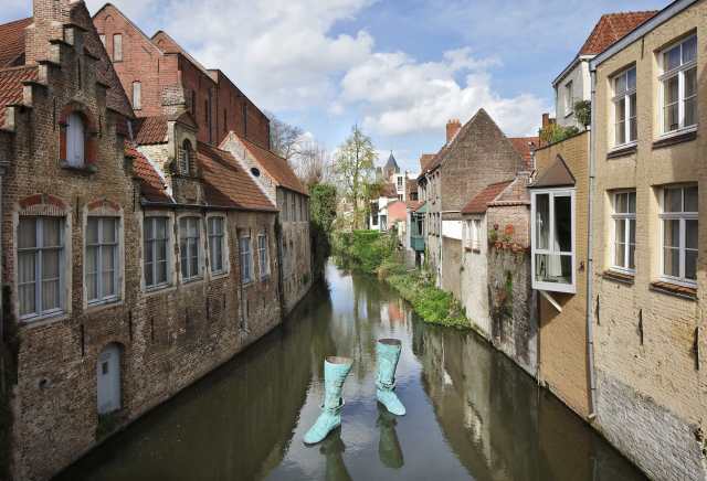 A pair of sizable bronze boots have paused in a Bruges canal, the whereabouts of their owner unknown. The striking bronze sculpture titled “Who?” by Ivan Argote appears as if an 18th-century statue has been shorn at the knees, inviting speculation about the wearer’s identity.