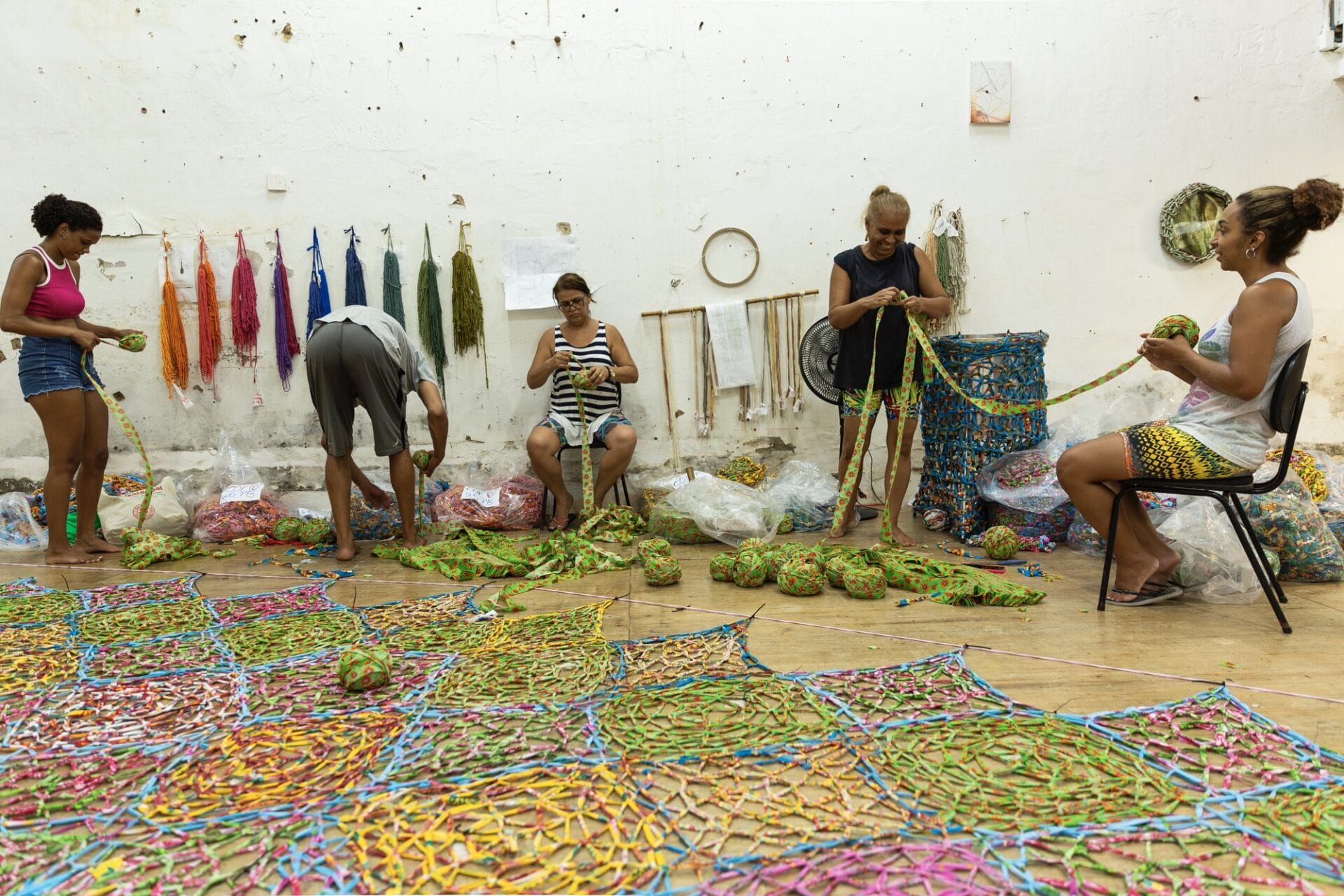 Created with a team of assistants in his expansive Rio de Janeiro studio, the new piece draws on images of sails and maritime materials like canvas and rope. Neto nods to the history of transatlantic voyages between Europe and South America, stitching remnants of bright chintz, common in Brazil, into a swathe of fabric punctuated by points of interest like a vessel full of decorated drums or corn kernels, a symbol of international trade. Historically, the percussive instrument kept a rhythm for the galley rowers, some of whom would have been enslaved people.