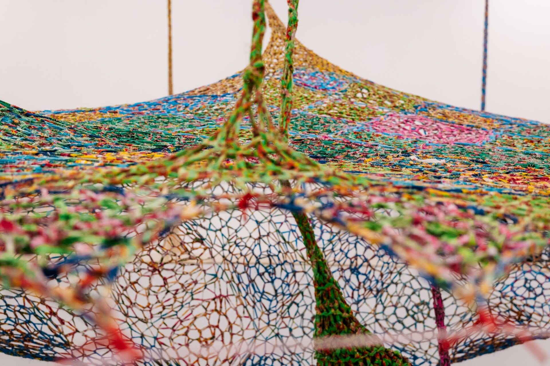 An enormous, cascading installation of crocheted fabric strips stretches across a cavernous gallery in Ernesto Neto’s newest exhibition. At MAAT in Lisbon, the Brazilian artist (previously) presents Nosso Barco Tambor Terra, which translates to “our boat drum Earth,” a solo exhibition encompassing one of the largest suspended sculptures he has ever made.