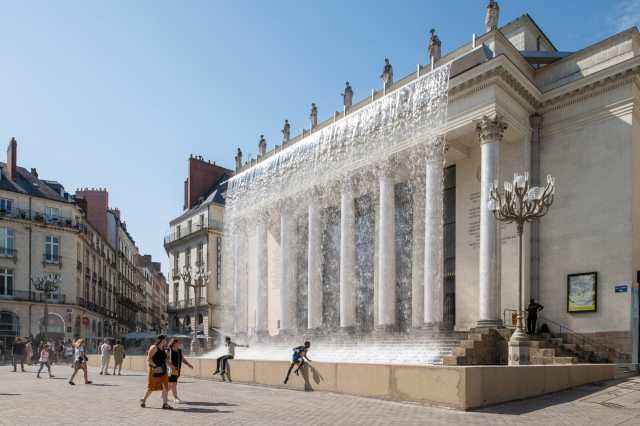 “Rideau” (2020), in situ installation at Théâtre Graslin, Nantes, France, water, pumps, pond installation in situ. Photo © Martin Argyroglo, courtesy of the artist and Galerie Aline Vidal.
