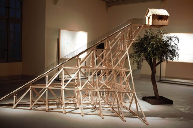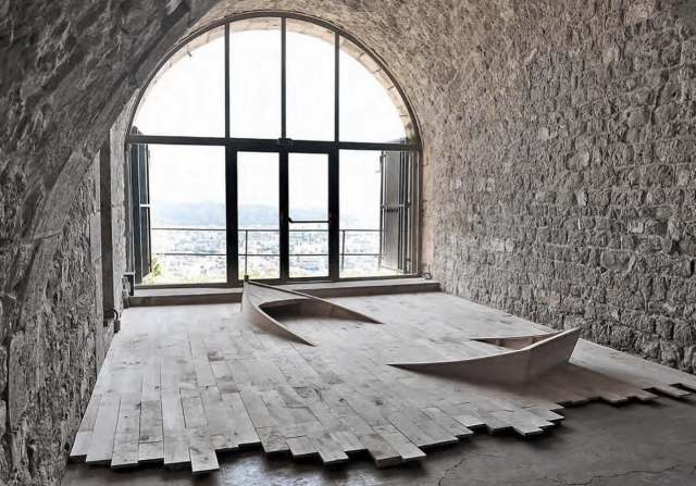 Paris-based artist Stéphane Thidet invites viewers into wondrous worlds that skew perceptions and distort the laws of physics: a small wooden boat appears to arise from hard planks, flat stones nest inside a bookcase where paper tomes once stood, and water cascades from a Nantes theater making it impossible to enter without being drenched. Crafted with familiar materials and subject matter, Thidet’s site-specific installations and sculptures twist common scenes into unexpected territories.