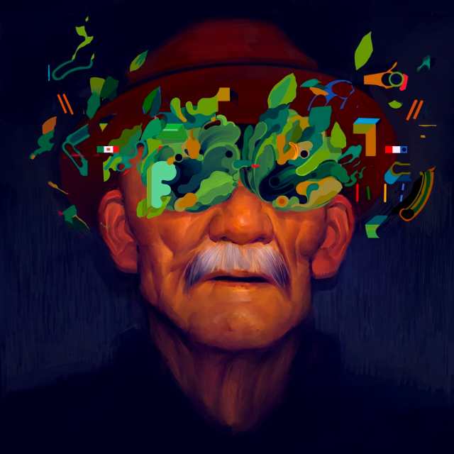 These classifications help the San José-based illustrator “bring order to the chaos of making art,” freeing him to focus on the stories he wants to tell. Employing bold, chromatic palettes, Rodriguez superimposes symbols, signs, typography, cartoons, and patterns atop his subjects as a means of expression. The frenzied additions visualize the sitters’ unseen preoccupations and interests, whether it be a childhood love for Dragon Ball or verdant, cabbage-like clusters sprouting from a figure’s eyes.[…]