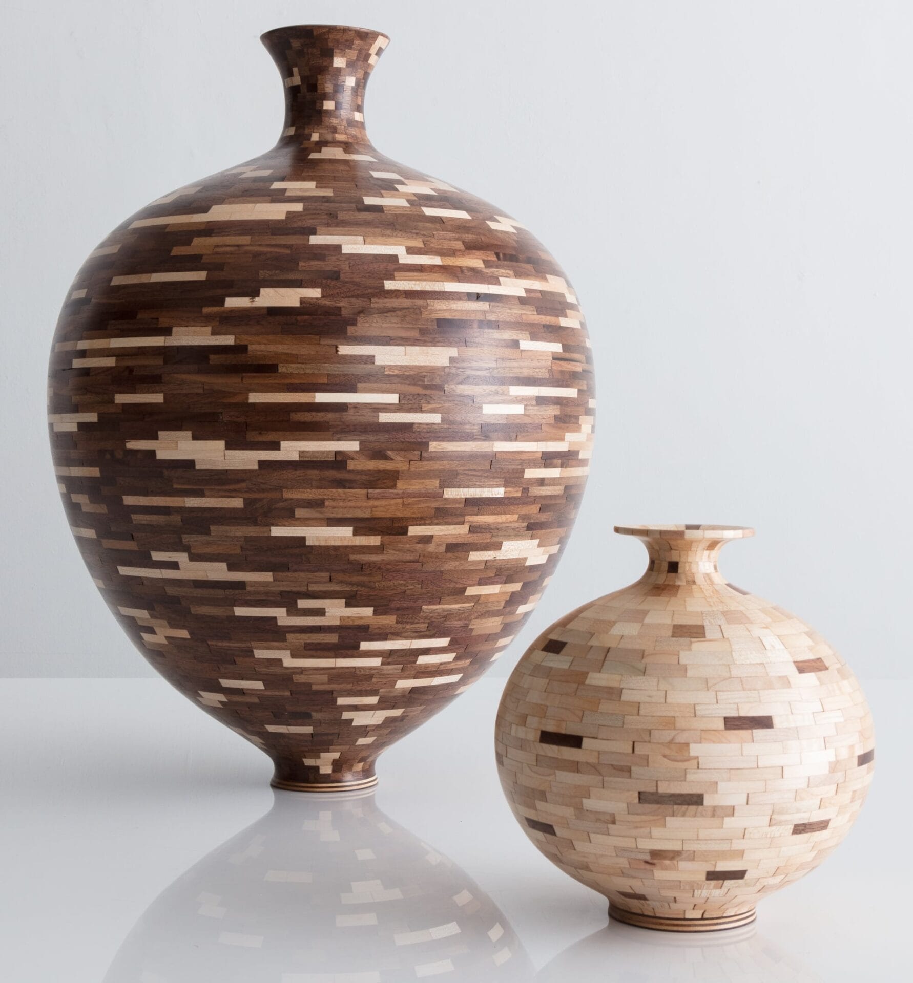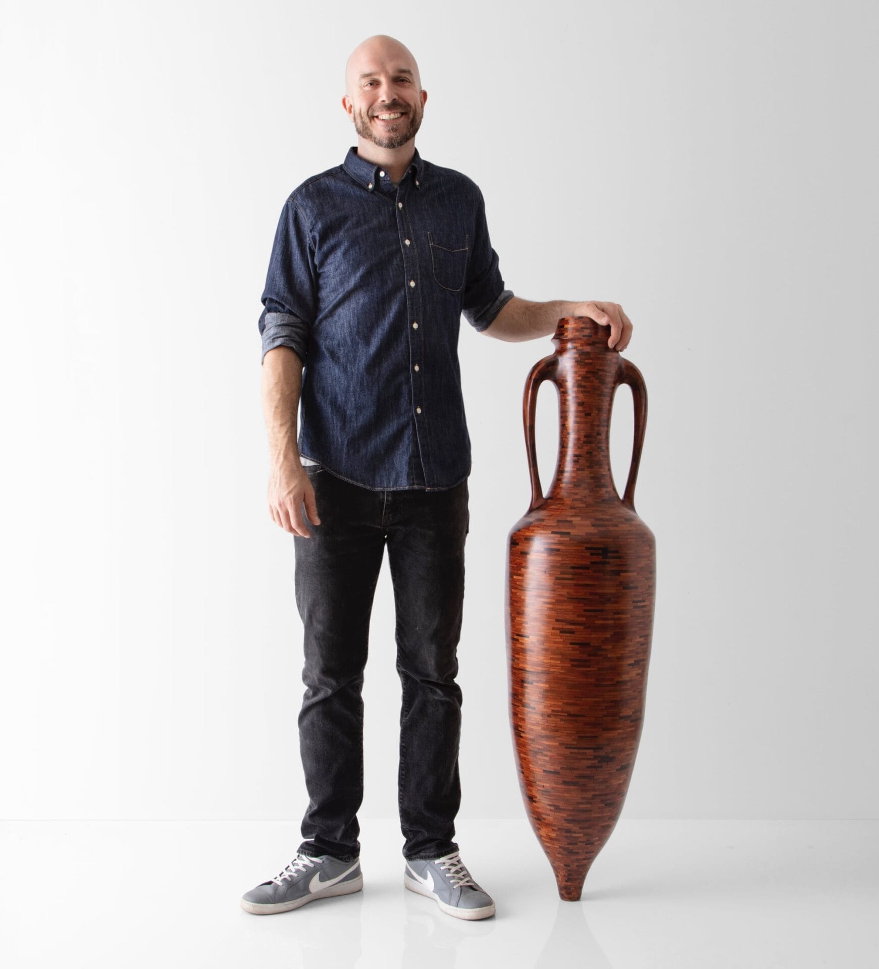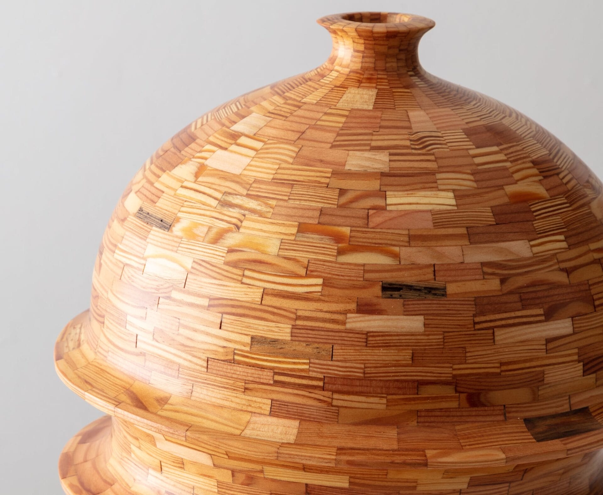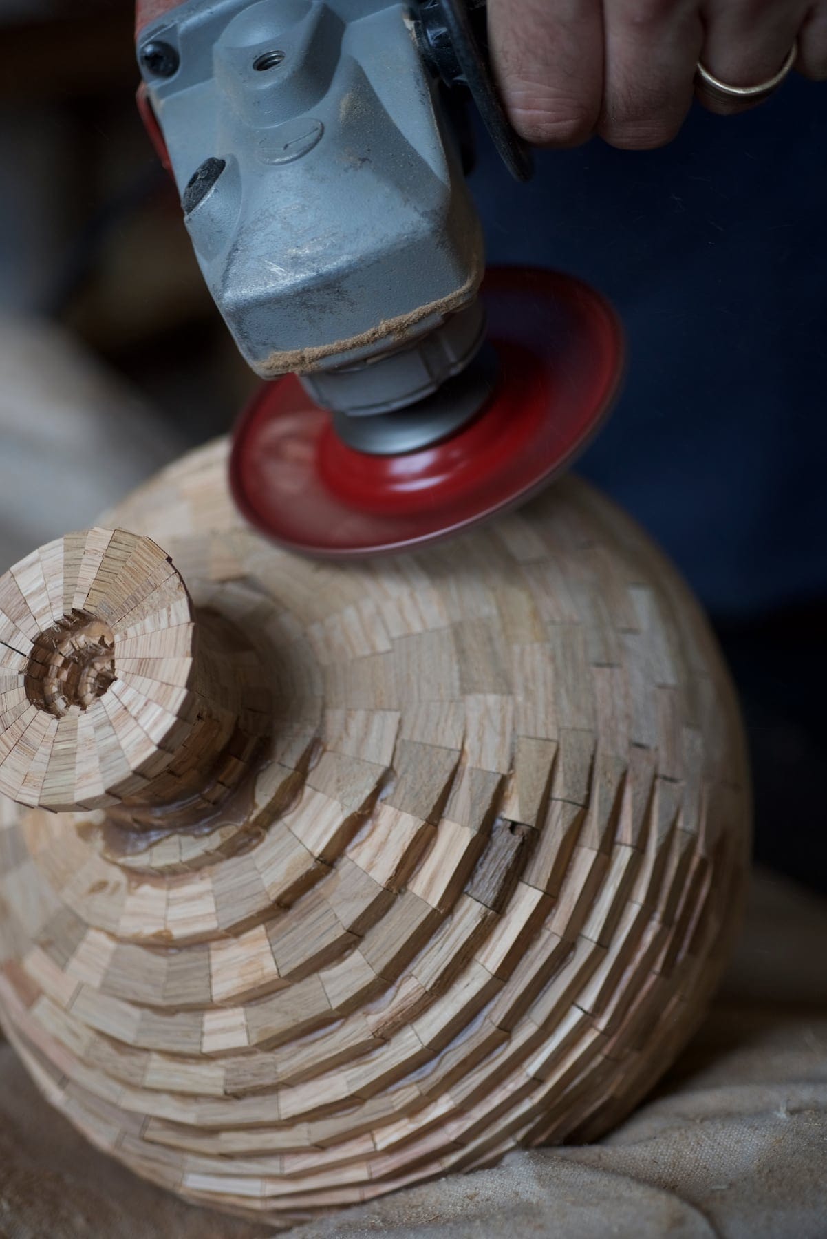 Armed with quarter-inch hunks of plywood pulled from the dumpster, Haining realized the first vessel in his ongoing STACKED series. The Brooklyn-based artist shapes each curvy form by gluing together each rung piece by piece, which lets him adjust the wall thickness and final profile as he works. “Imagine coil pottery…or an analog version of 3-D printing,” he adds, likening the process to ceramics. Once the shape is complete, he uses an angle grinder and various hand tools—but not a lathe—to smooth the surface and allow the individual grains to shine through. […]