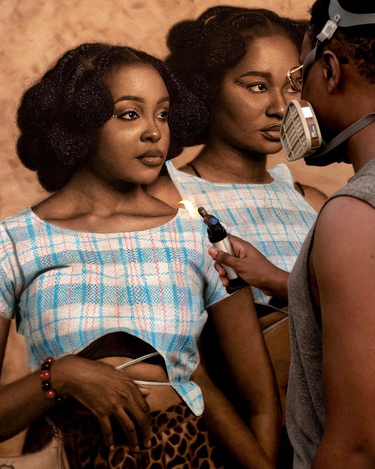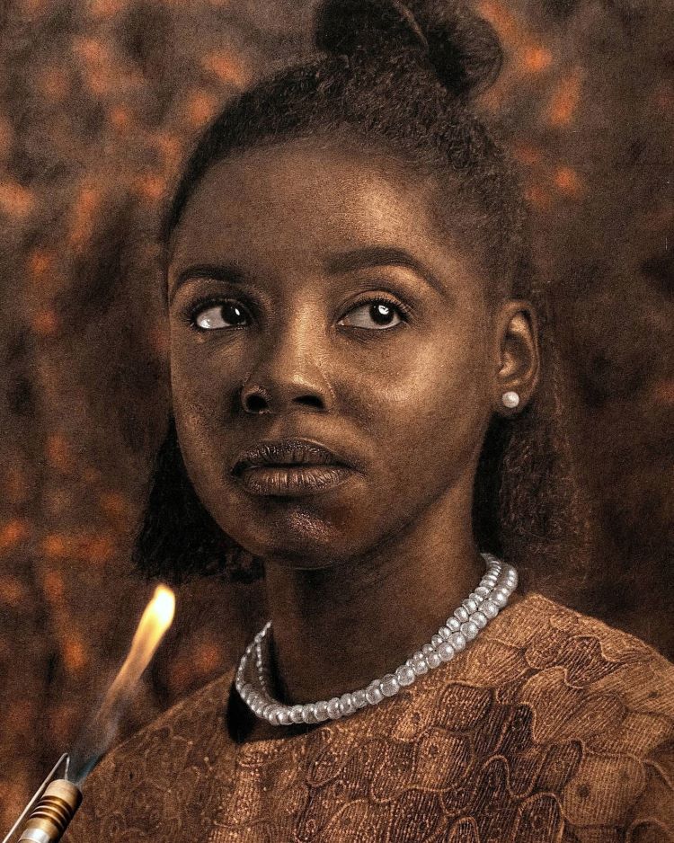 Idoko’s portraits are so full of life and emotion that at first glance, it seems as though you’re looking at a sepia-toned photo. Once you realize his images are actually made by hand, it’s natural to think he crafted the lifelike portrait with pencil on paper. It’s only when he shares his process on social media that it becomes clear that the artist never picks up a pencil at any stage of his creative process. Instead, he reaches for a blowtorch. Idoko uses the controlled flames to darken the canvas and create the illusion of depth and texture, which provides the lifelike appearances that his portraits are known for.
