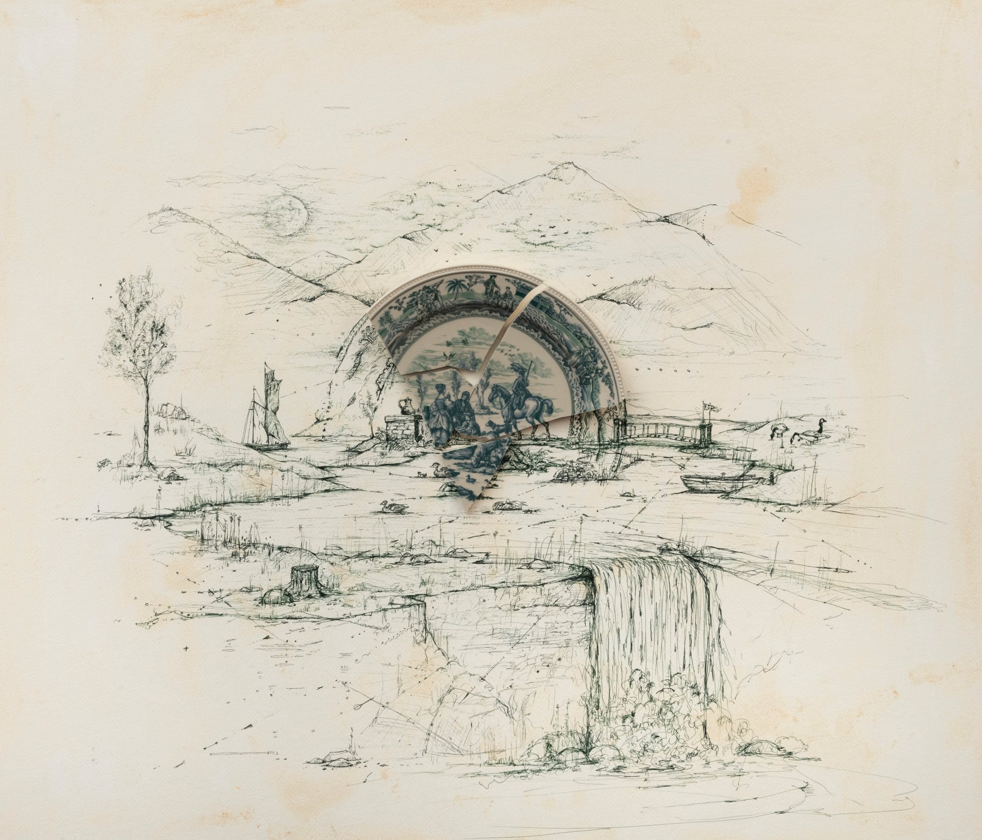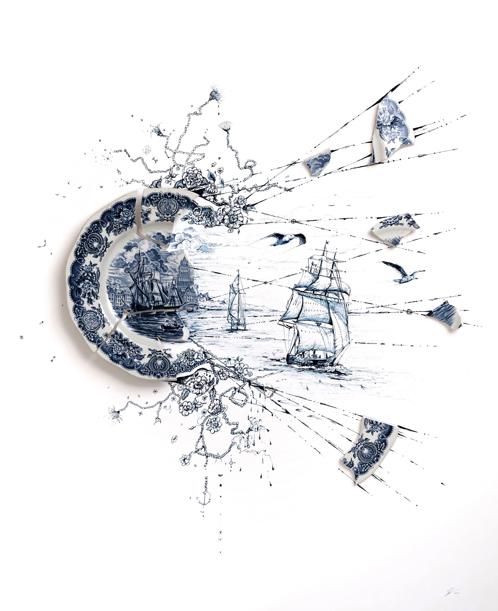 We often associate objects with memories—a stuffed bear reminds us of childhood playtime or a family heirloom of a beloved ancestor—but for Robert Strati, certain items also contain narratives of their own accord. The artist (previously) draws elaborate scenes that appear to burst from shattered porcelain plates as part of his Fragmented series. Perfectly matching ink to the design on the dinnerware, Strati expands the story within the vessel to the paper below, rendering large-scale, monochromatic scenes that seem to emanate from the original composition. =[…]
