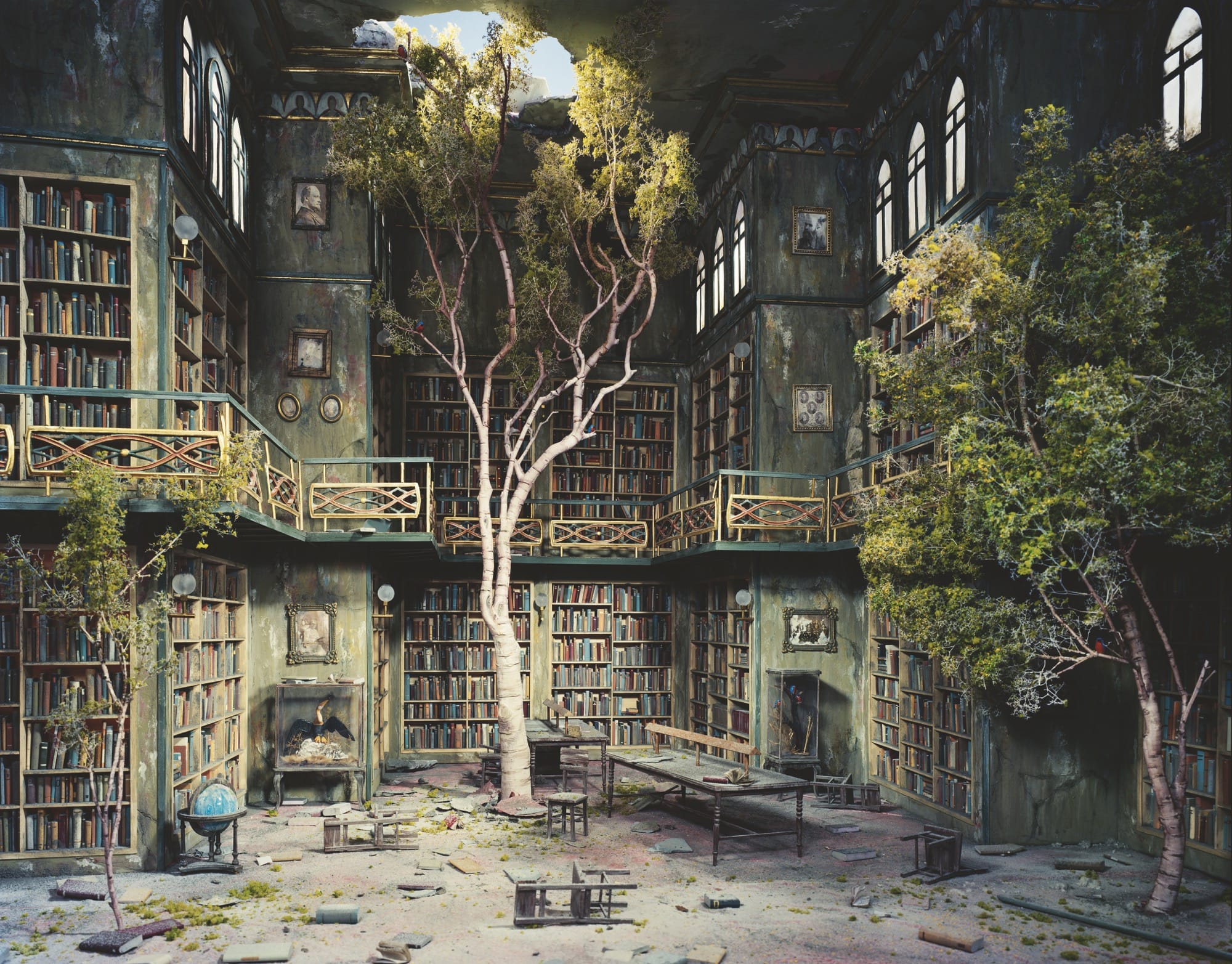 Lori Nix and Kathleen Gerber, “Library” (2007), archival pigment print, 48 x 60 inches. Image courtesy of Columbus Museum of Art, Ohio, and Harn Museum of Art, Gainesville, Florida