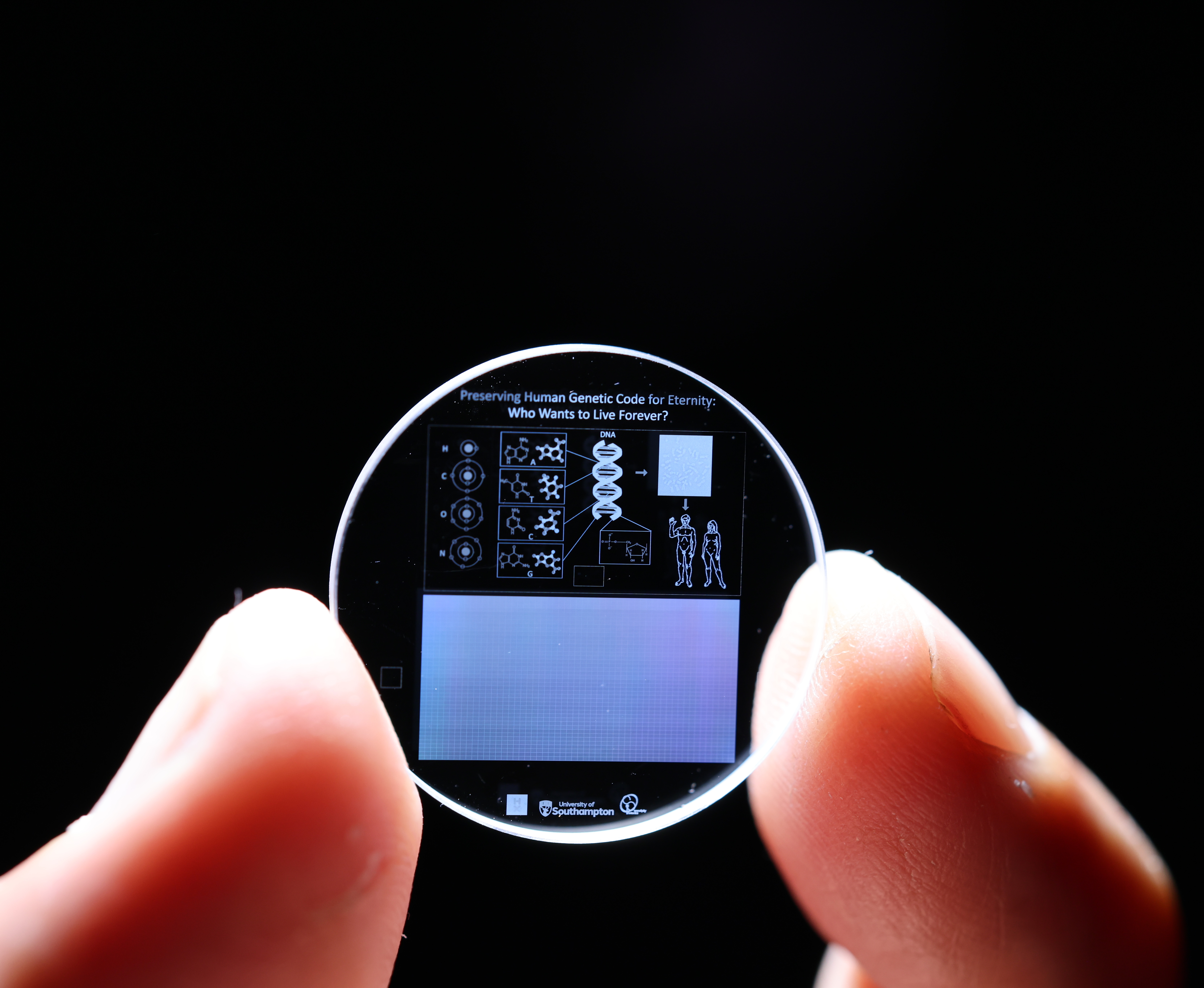 The team at Southampton, led by Professor Peter Kazansky , use ultra-fast lasers to precisely inscribe data into nanostructured voids orientated within silica – with feature sizes as small as 20 nanometres.