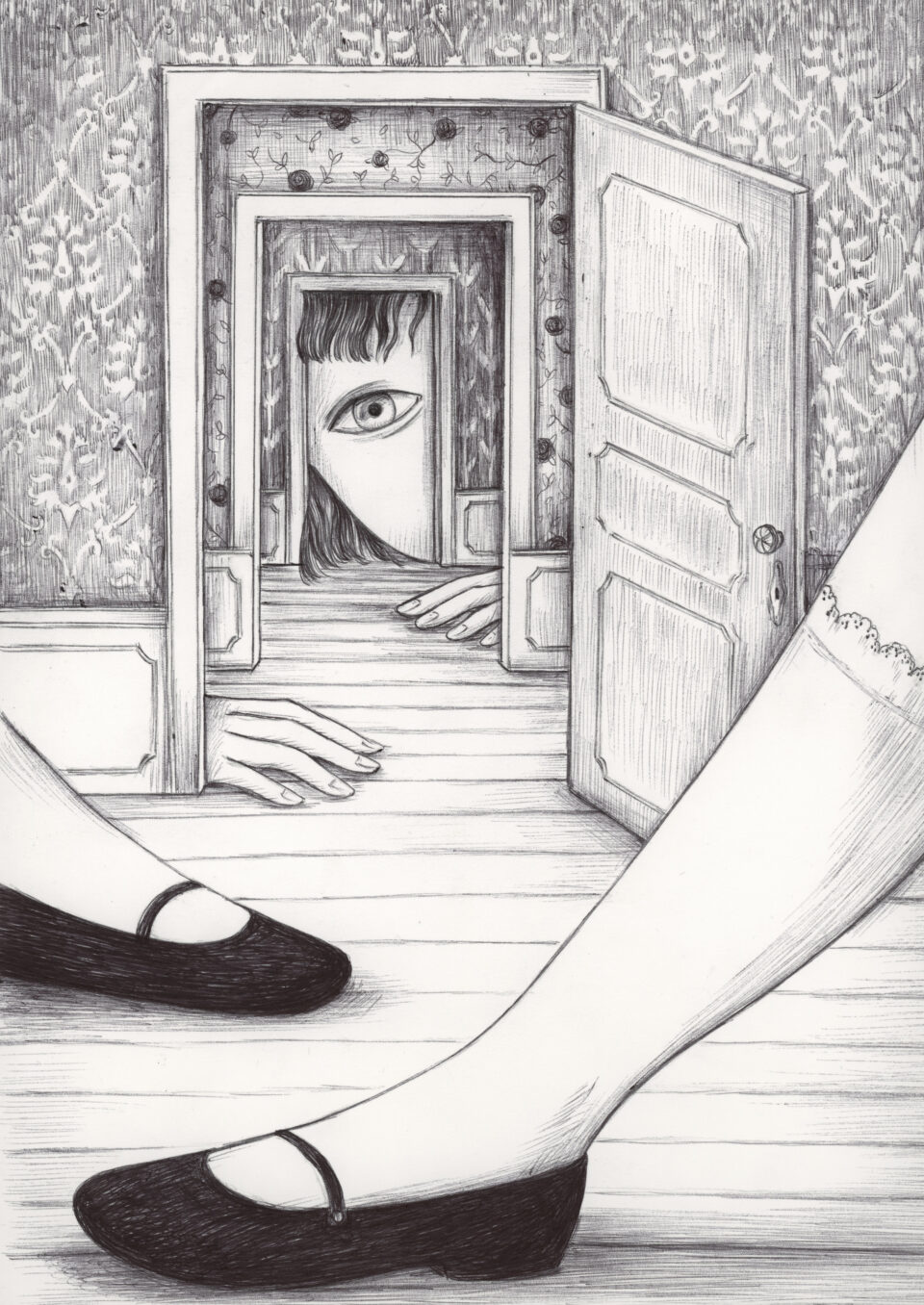 Visually simple yet conceptually unbounded, Italian illustrator Virginia Moricontinues to create scenes that proliferate from her imaginative world of inner emotions. “I often take inspiration from dreams, nightmares, hallucinations, and long walks in nature,” Mori says. Rippling water, nested doorways, and liquefied lenses lend to an air of surrealism, indicative of the artist’s distinctive style.