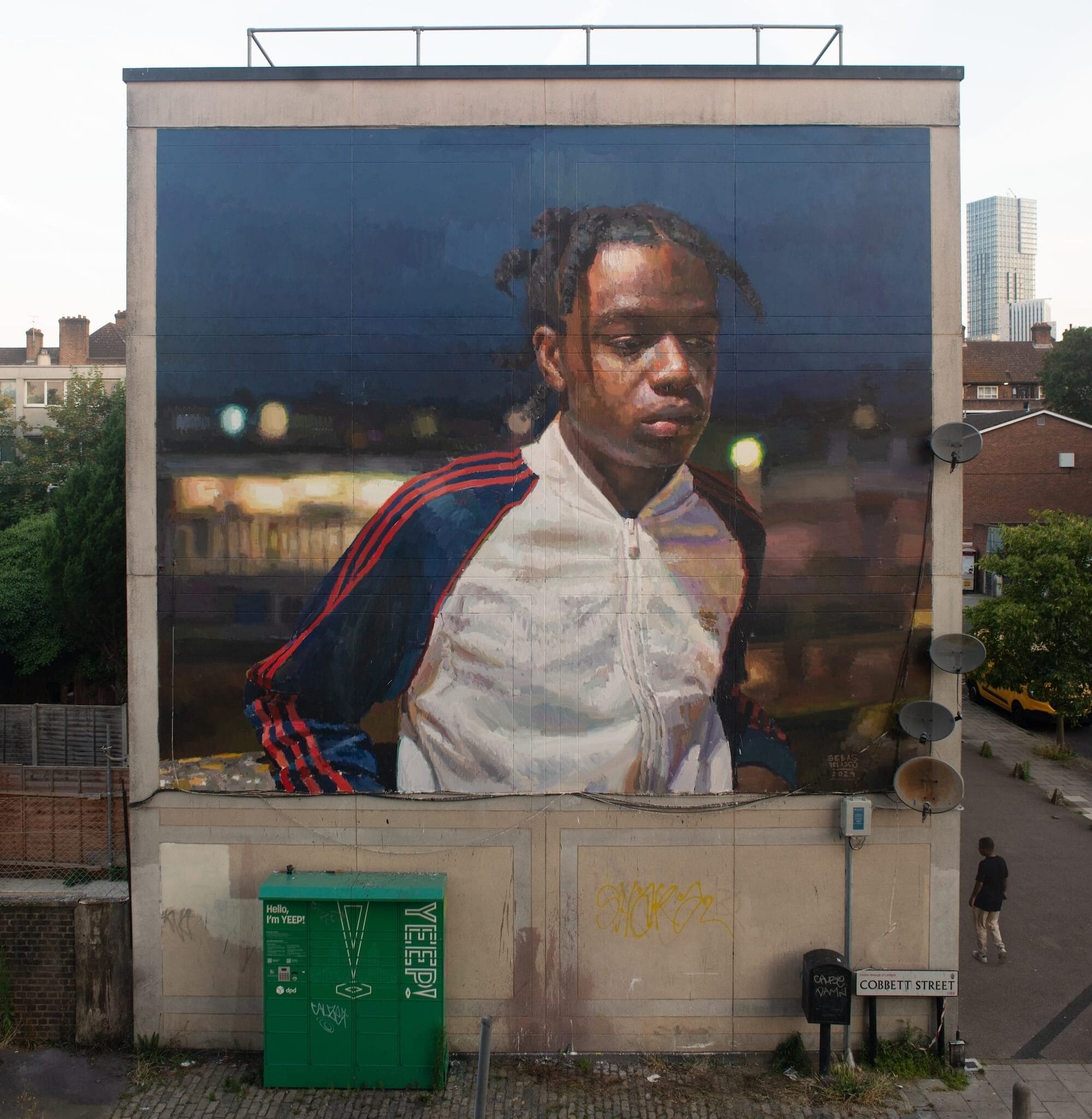 Drawing from photographs of landscapes and cinematic portraits, Sebas Velasco’s murals and paintings boldly capture people and places. For the 2024 London Mural Festival, the artist has unveiled a large-scale portrayal of a local resident of Brixton, where the piece was recently installed on the end of a residential building.