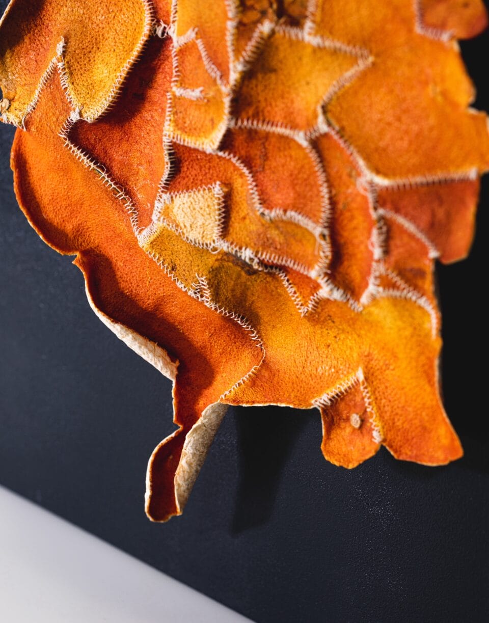 Around the frame of a spherical pendant lamp, designer Alkesh Parmar wraps an unexpected shade. Through Studio Arp, his ongoing project Citrus Sinensis reimagines orange peel waste into a leather-like, organic patchwork fabric that can be applied to an array of functional and decorative objects.