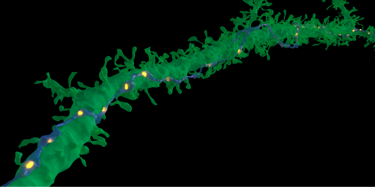 In very rare cases, a single axon (blue) made repeated synaptic connections (yellow) with a target neuron (green). The purpose of these very tight connections is not yet known. Credit: Google Research & Lichtman Lab (Harvard University). Renderings by D. Berger (Harvard University).