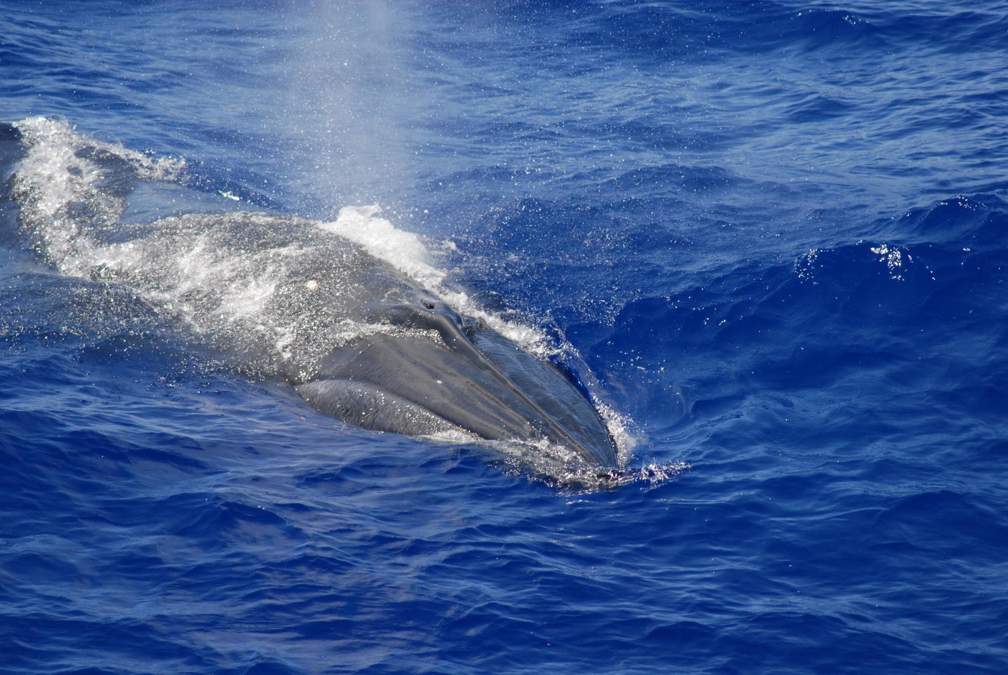 Photo of a Bryde’s whale spotted during a NOAA cetacean survey in the Mariana Archipelago in 2010 (Credit: NOAA Fisheries/Adam Ü, NMFS MMPA-ESA Permit #14097).