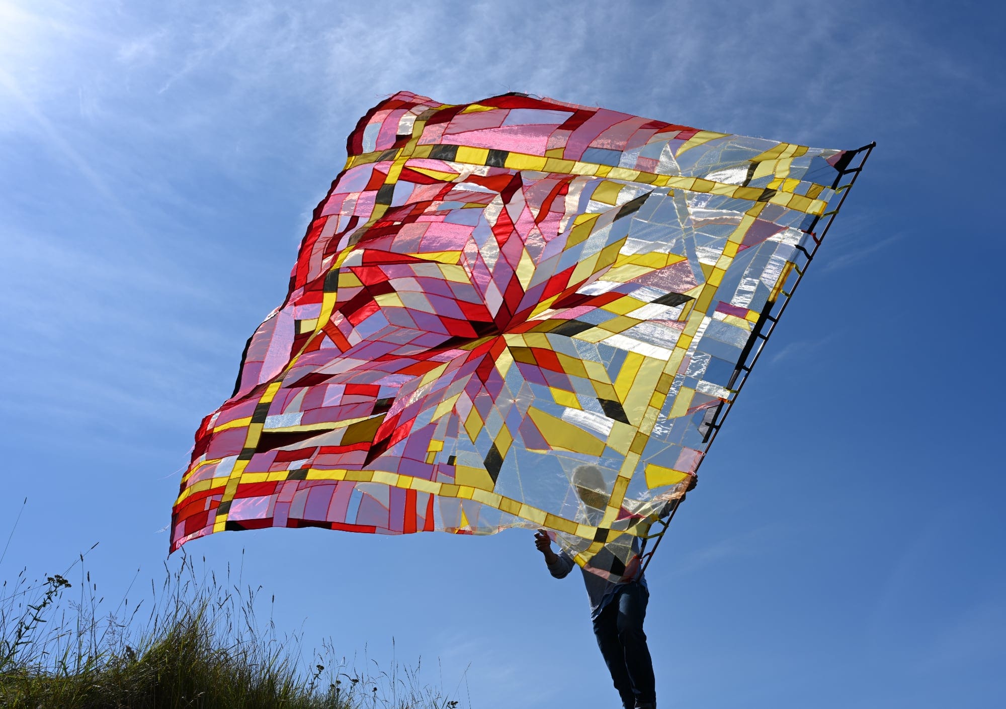 In his ongoing Grass Quilts series, Wally Dion stitches translucent textiles into large-scale patchworks that glimmer in the sun.