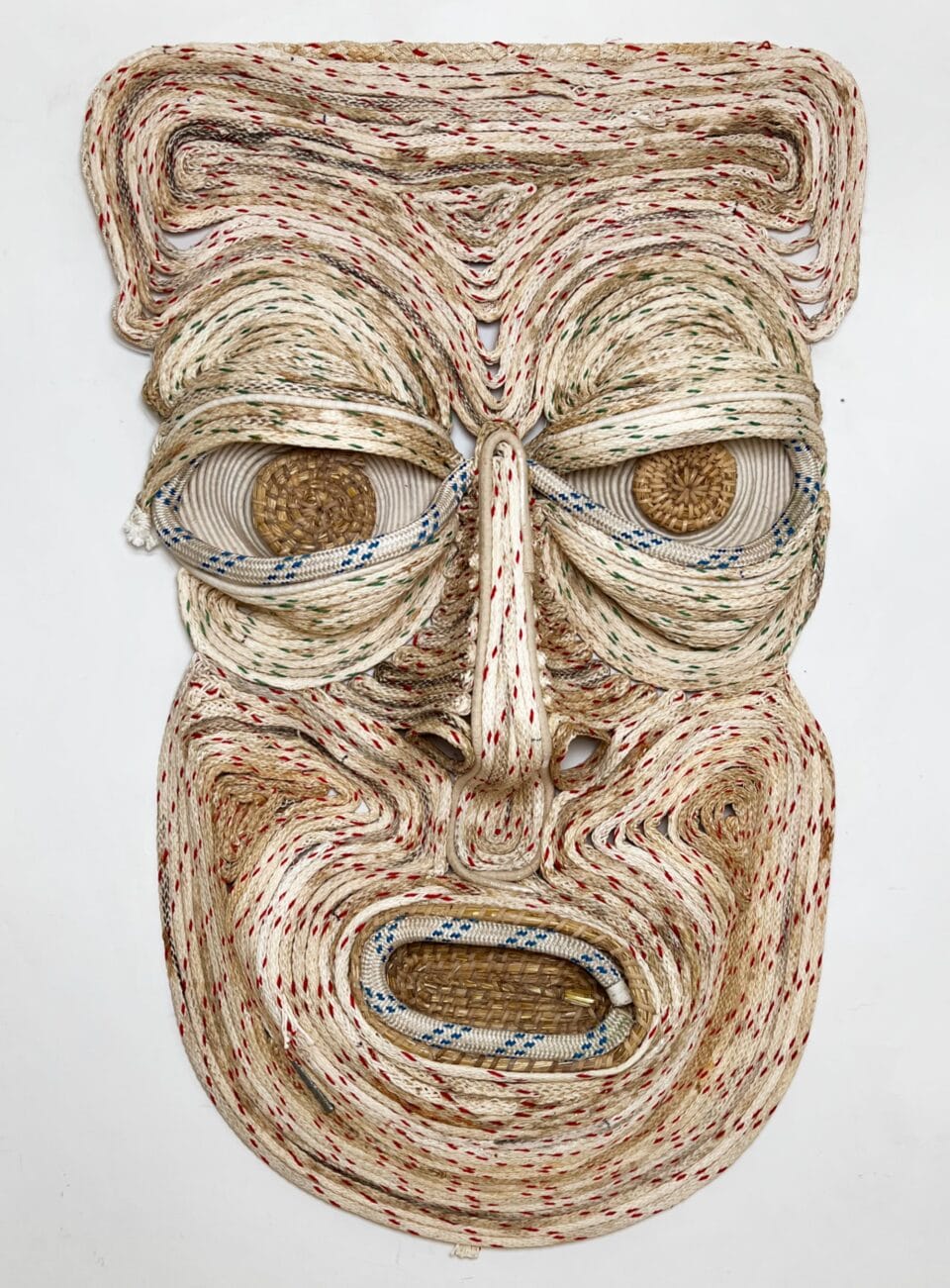 Once desiccated, the materials often become the structure for thin, colorful yarn the artist wraps around the strands. The finished works are sometimes abstract and others boldly figurative, portraying exaggerated facial features in coiled, hand-stitched patchwork.