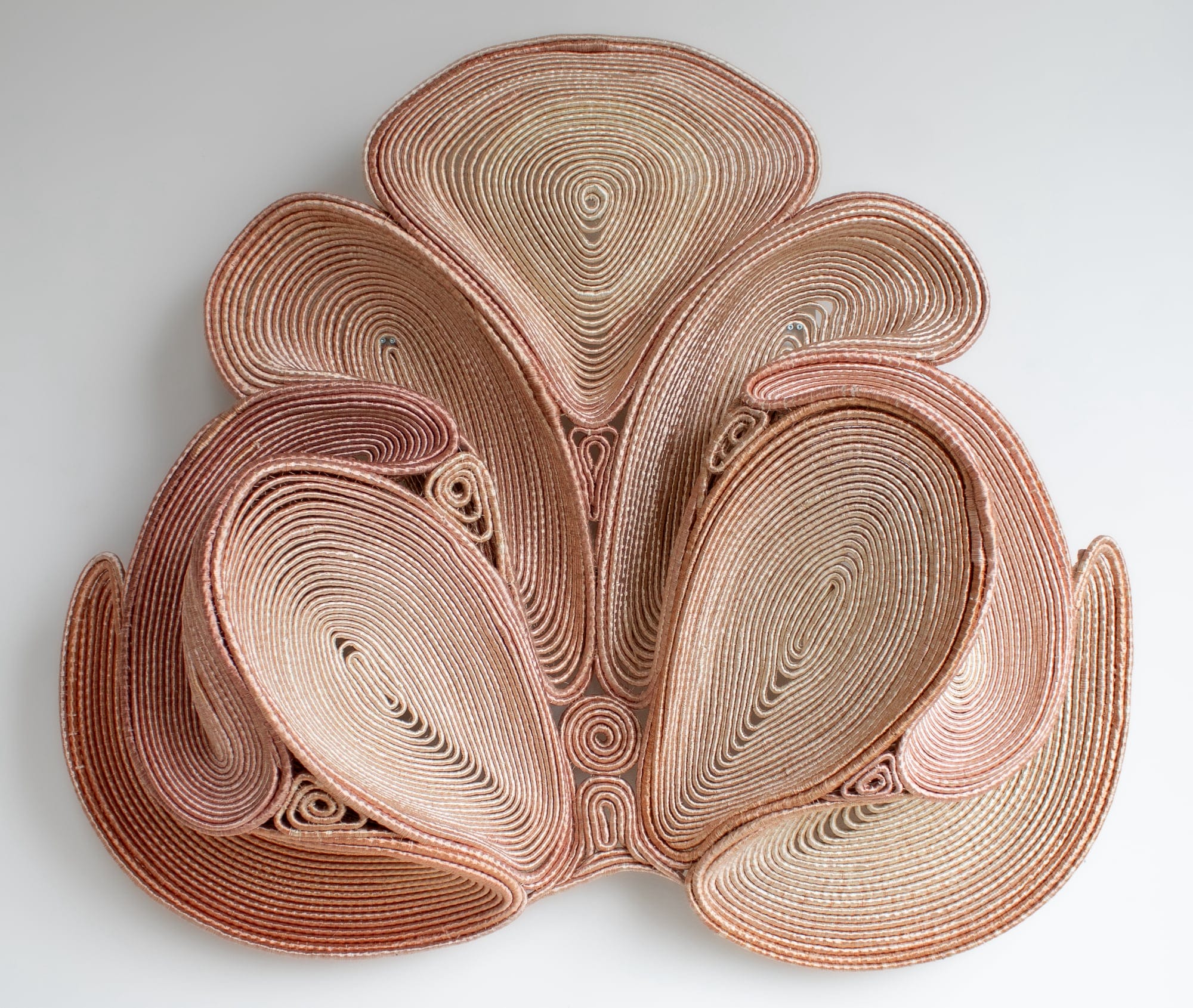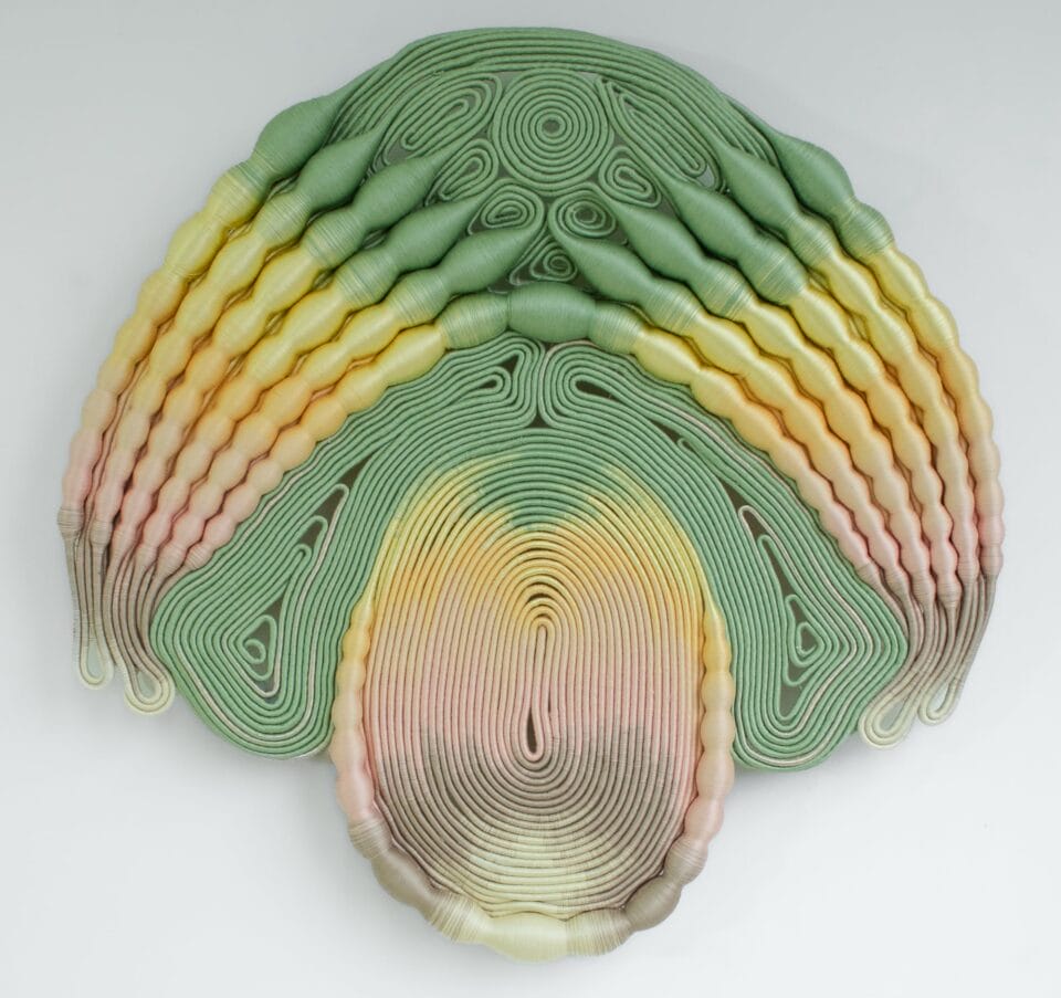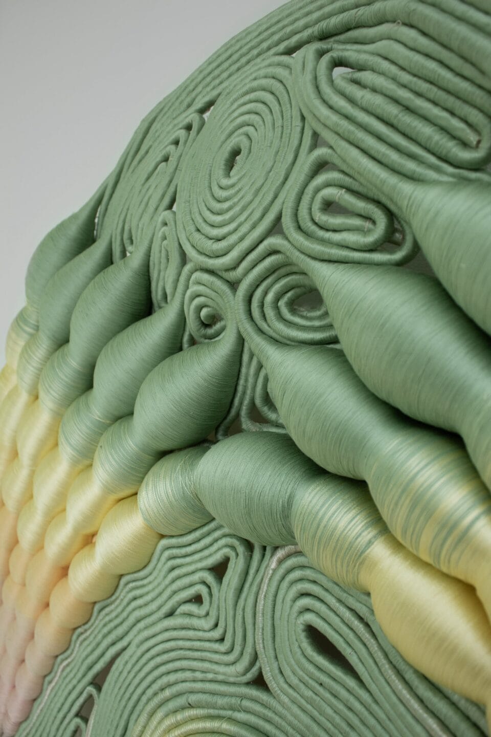 The process is labor-intensive, but the slow, methodical movements are part of what Schneider is drawn to. “Each turn of the yarn around the rope is a quiet, focused act. There is something very grounding about it. The rhythm of wrapping, the gentle tension of the yarn, and the soft texture of the fibers create a peaceful space where the world outside seems to fade away,” she says. The resulting works retain evidence of this meticulous process as coils large and small swell outward in perfectly concentric circles.[…]
