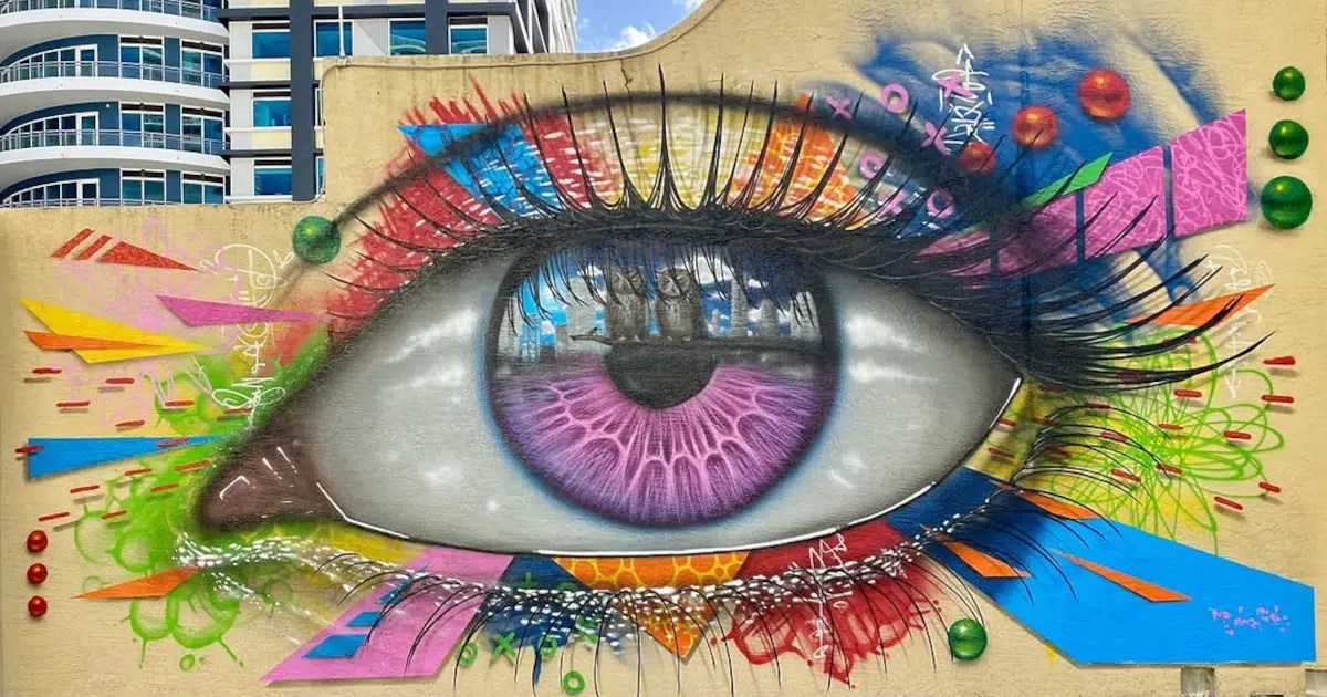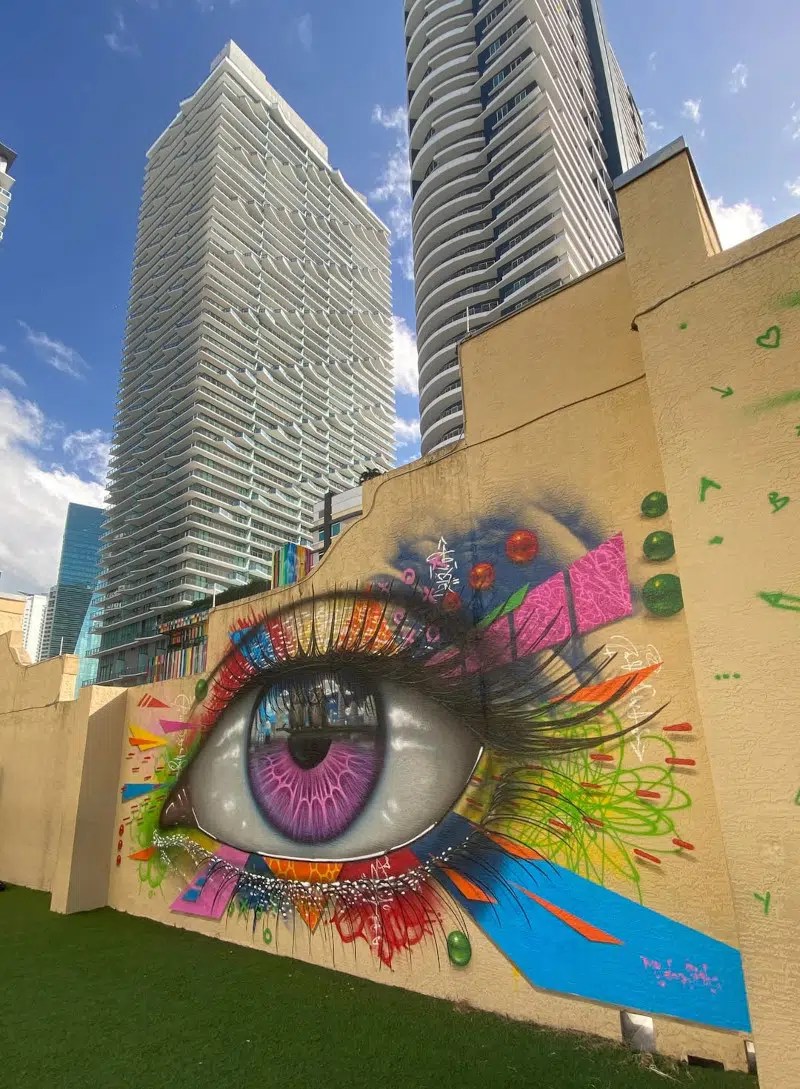 Recently, My Dog Sighs took his now world-famous colorful eyes to Miami Art Week. There, he transformed four walls into brightly colored pieces. While still connected thematically, the pieces serve as the perfect example as to why standing by a design or pattern doesn’t limit an artist. Instead, it inspires one to use their creativity to the fullest.