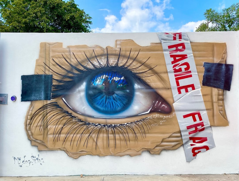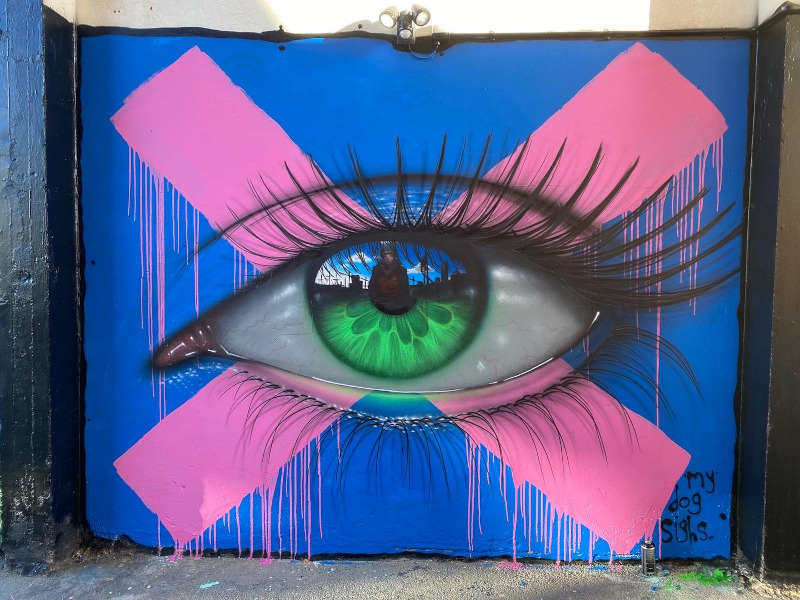While some recurring motifs have become synonymous with his work—from eye murals to can art—the true beauty in the work of My Dog Sighs is in the details, making each mural, each painting, and each experimental project unique and special.