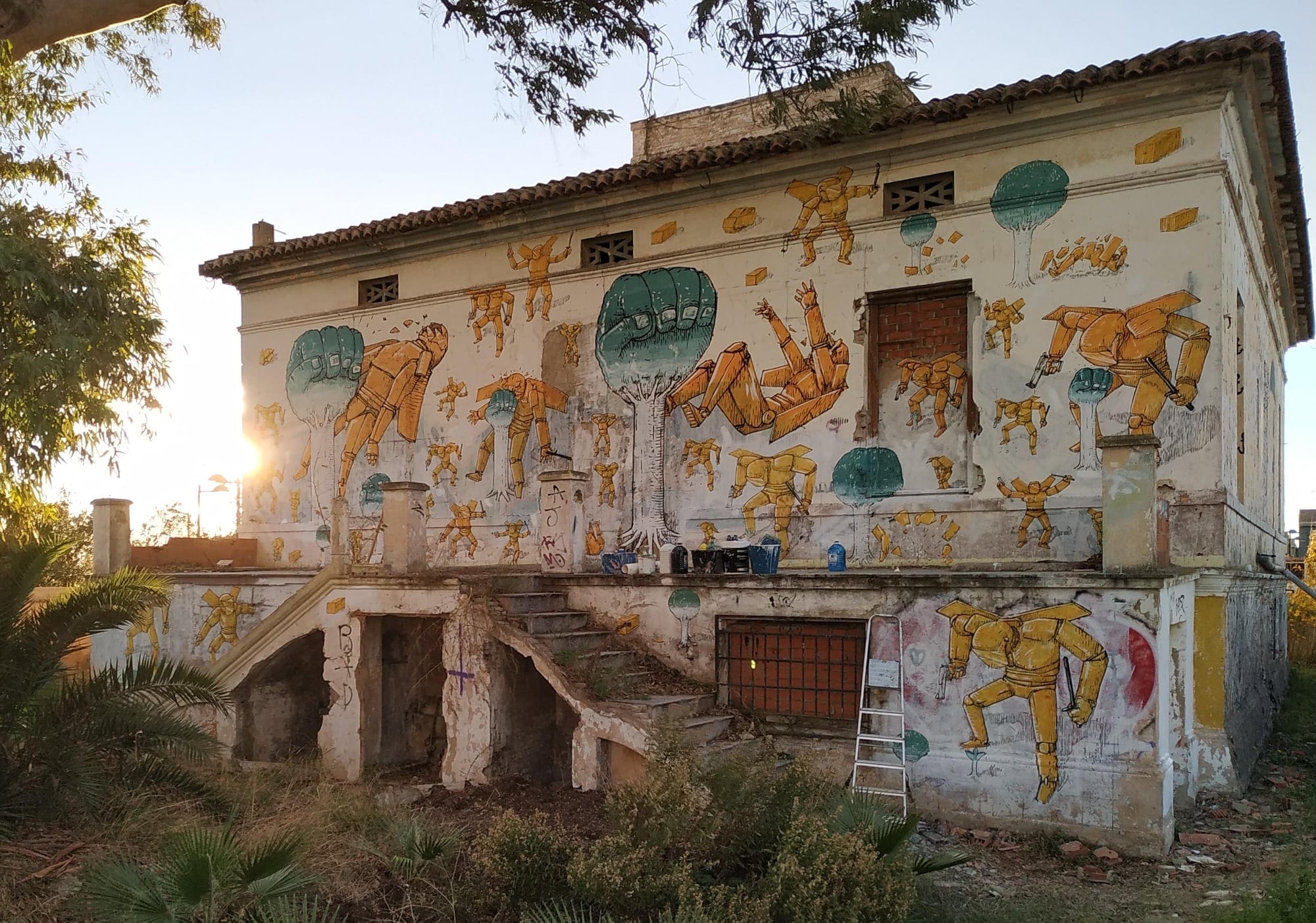 The 2022 festival centered around the government’s extension of the industrial area to the north, which would “mean, among many other things, the final lunging to the beaches of l’Albufera (and) the multiplication of air pollution of ships and truck traffic.” Part of a movement to halt the proposal, the public art event brought several muralists to the city, including Blu, whose multi-part work features a battle between fist-shaped trees and port defenders.