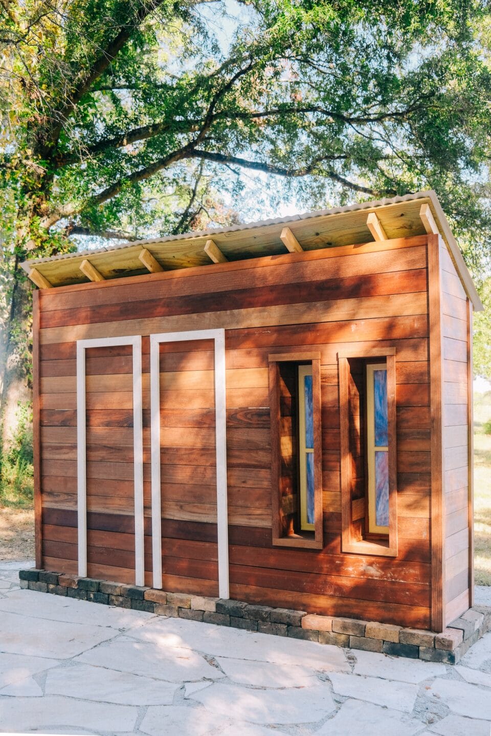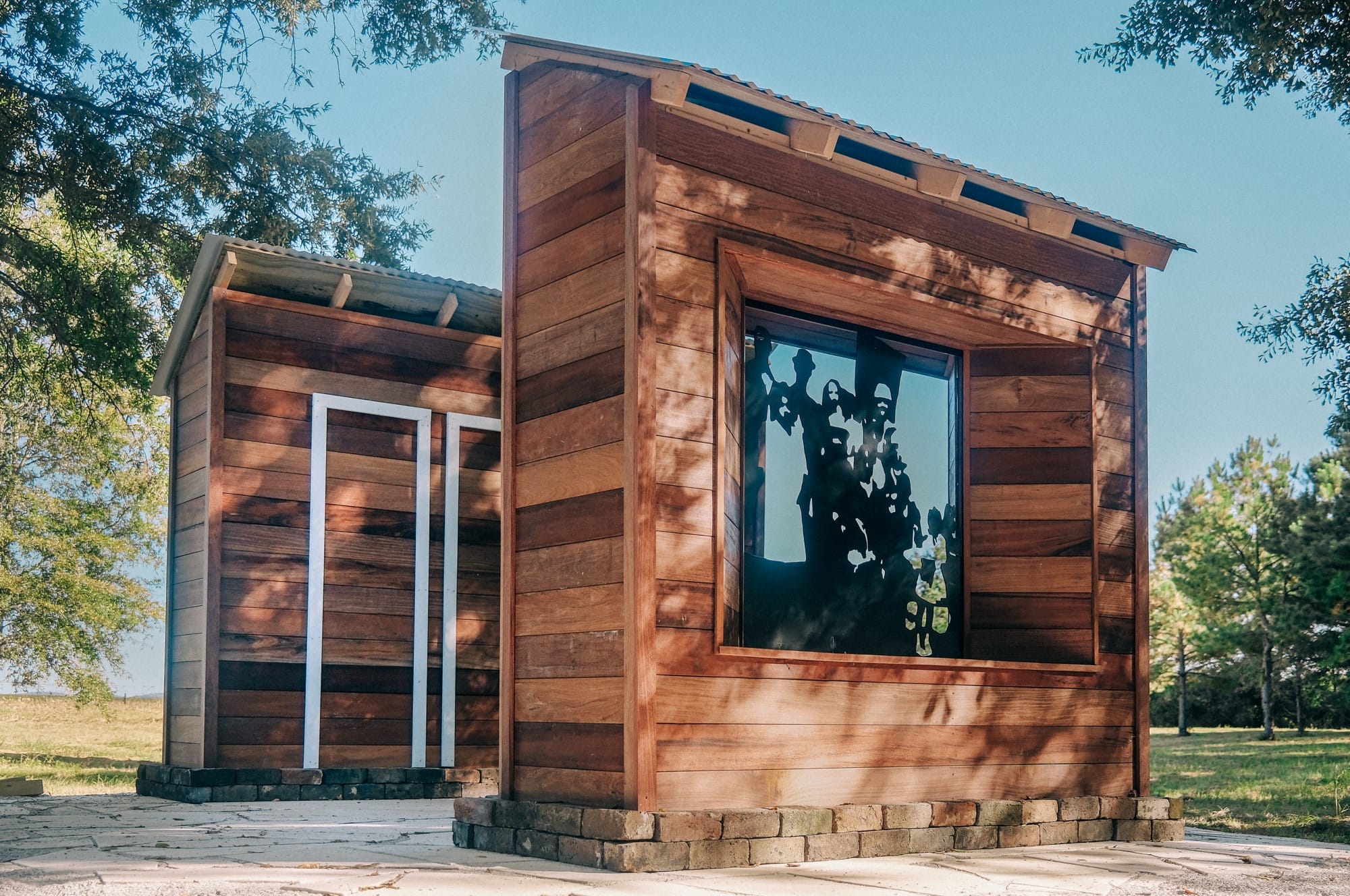 On the site of the former Scott’s Grove Baptist Church, artist Tony M. Bingham has constructed a monumental work of contemplation and reflection. Two wood-paneled walls stand parallel in the serene clearing with stained glass windows, a Sylacauga marble floor, and a steel cutout depicting members who once worshiped on its grounds.