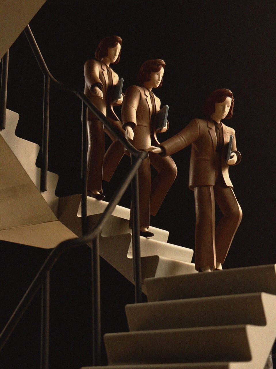 As the behind-the-scenes photos below show, each model had to be cut, sanded, and painted individually before being precisely placed in position. Ménard told It’s Nice That that elements like lighting, sound, and camera angles were particularly important to help convey emotion in TRIPLE BILL, which envelops viewers in a hypnotic critique of technology and its effects.