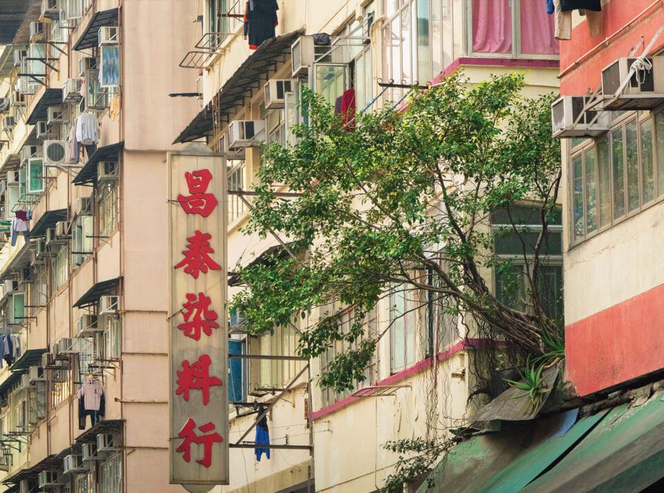 Jacquet-Lagrèze’s photos juxtapose balconies and window air-conditioning units with natural life, including the opportunistic Chinese Banyan that sprouts from many roofs. Birds typically eat its small figs and drop the seeds across the city, allowing the hardy trees to sprout amid even inhospitable concrete. “They can thrive and reach very large sizes until it becomes dangerous for the building and has to be taken down,” he says, noting that it seems there’s always one being rooted out.
